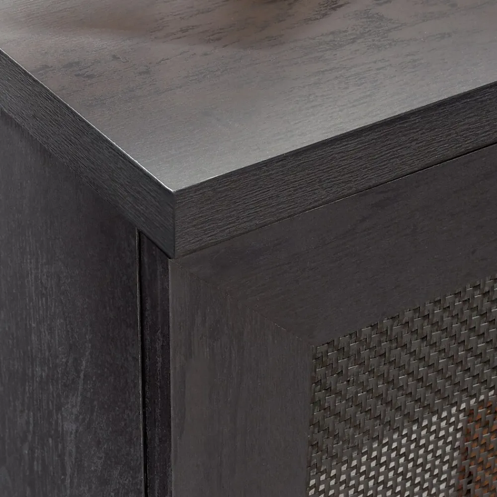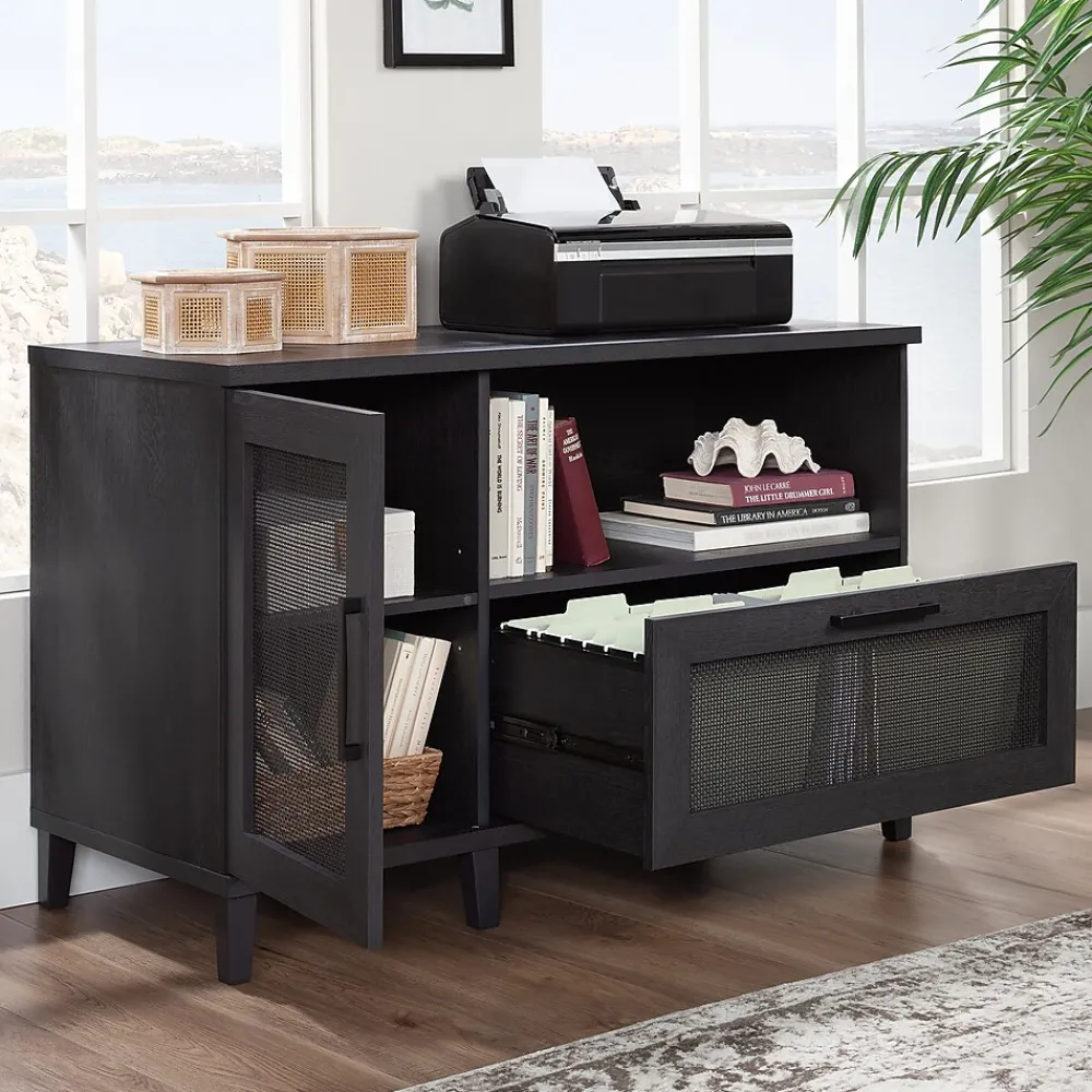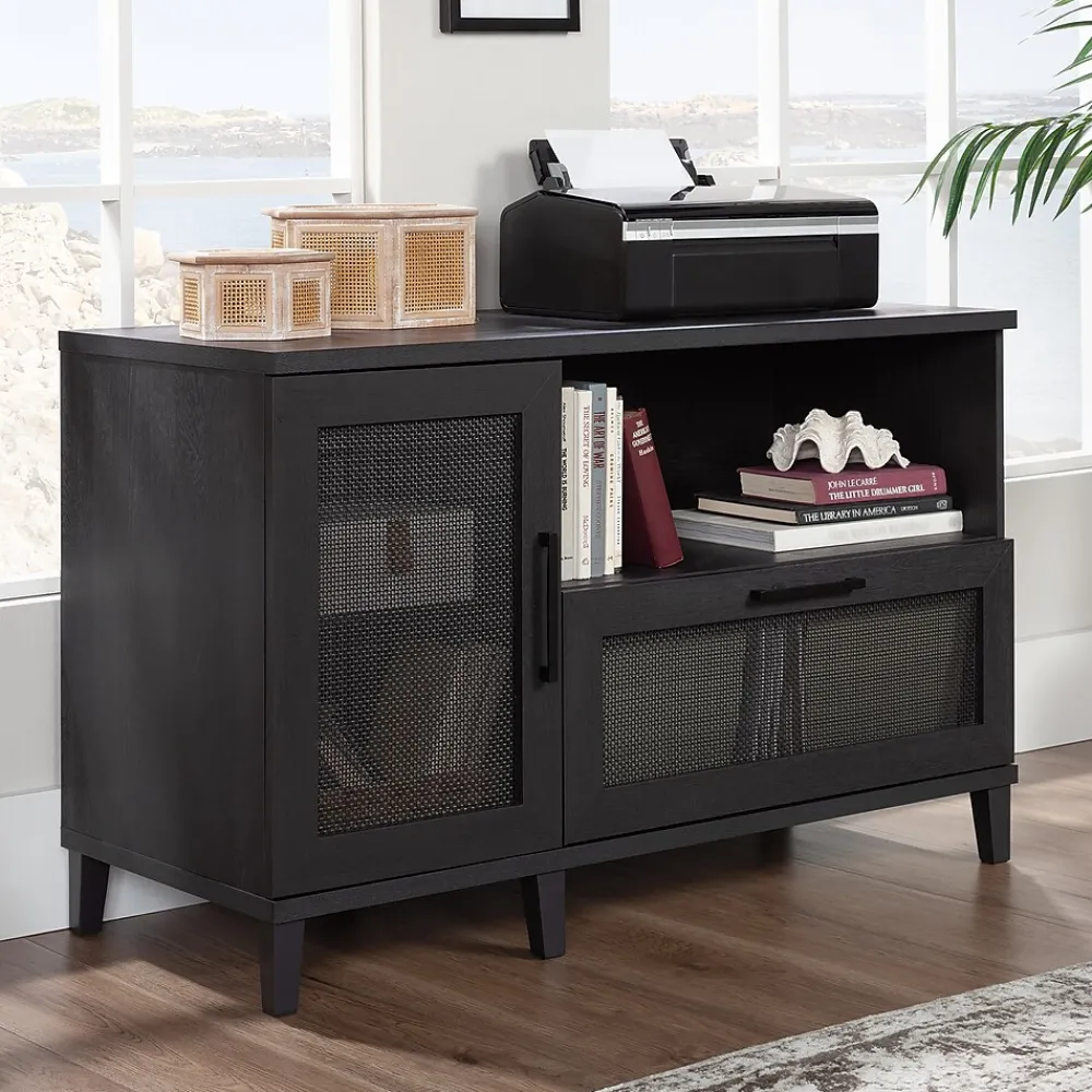 Add much needed storage space in your home office without feeling cramped with this handy and functional file credenza from the Tiffin Line collection. The spacious top surface of this office storage cabinet provides convenient storage for a printer or other equipment. This home office credenza features an adjustable shelf behind the door, allowing you to customize storage to your specific needs. Its versatile, sleek and adjusts to your needs, so what more could you ask for? Well, a file drawer would be helpful. This credenza with open shelf includes a file drawer with full extension slides that holds letter or legal-size hanging files. This keeps your documents organized, out of sight, and easy to locate. Finished in a dark Raven Oak and detailed with rattan insert door and drawer fronts, this office storage credenza is an attractive and highly practical addition to your home or office.