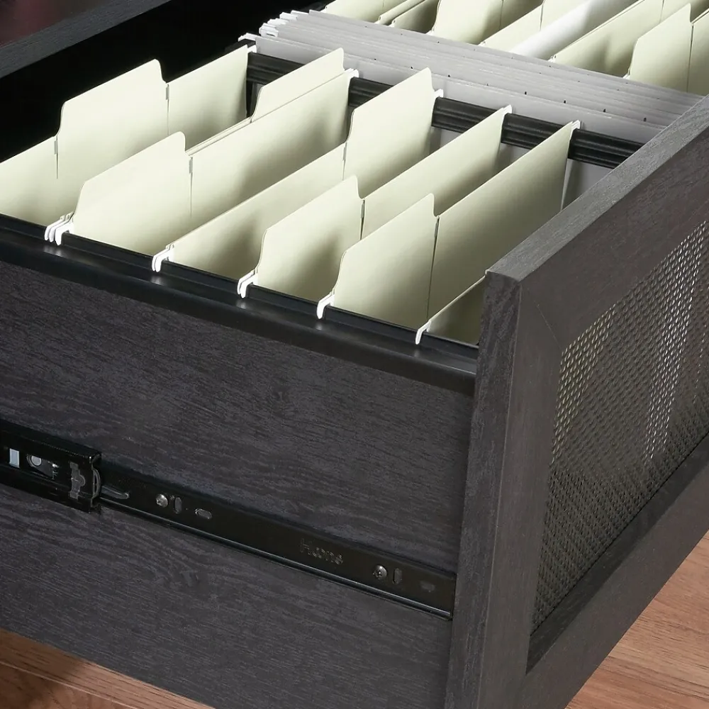 - File drawer with full extension slides holds letter or legal size hanging files