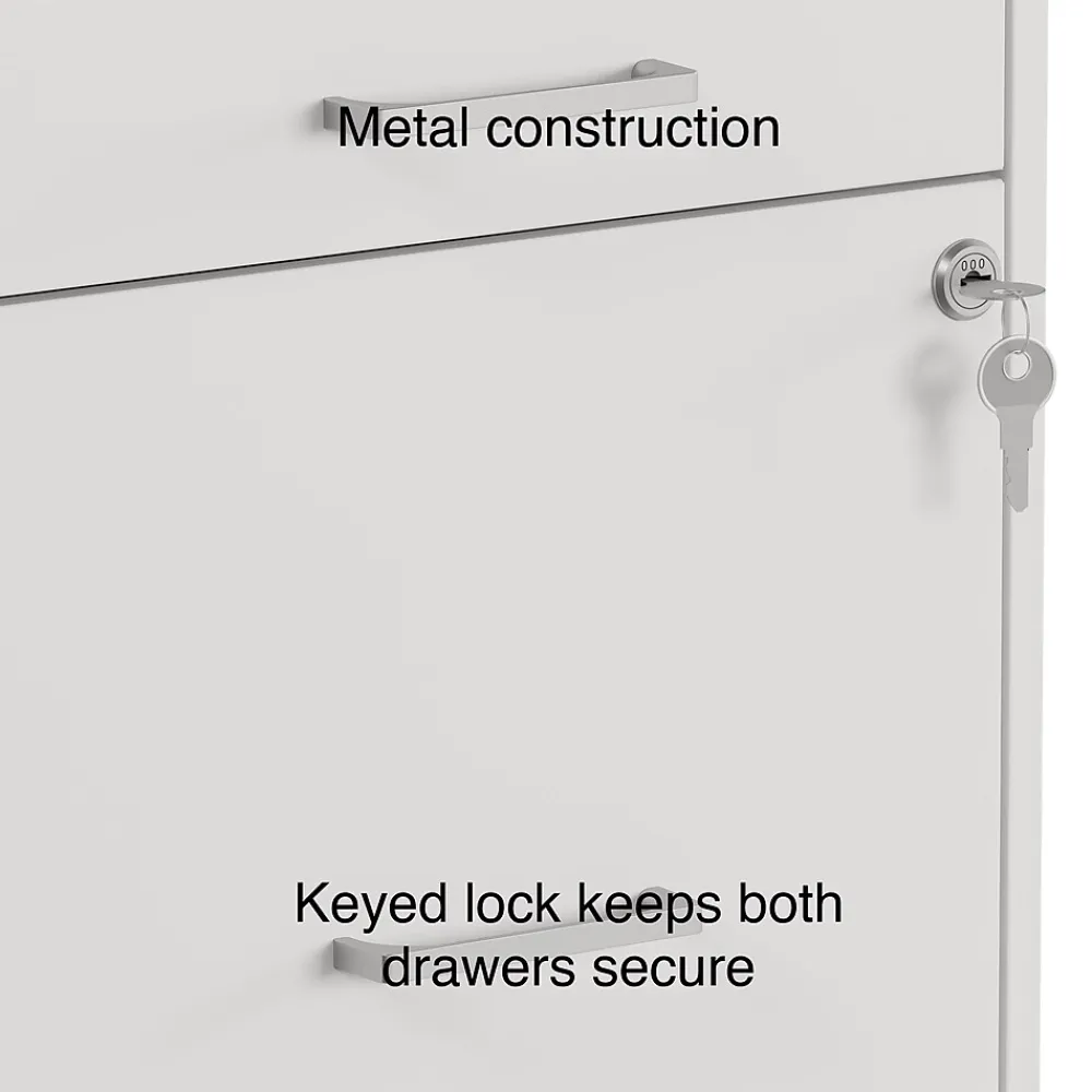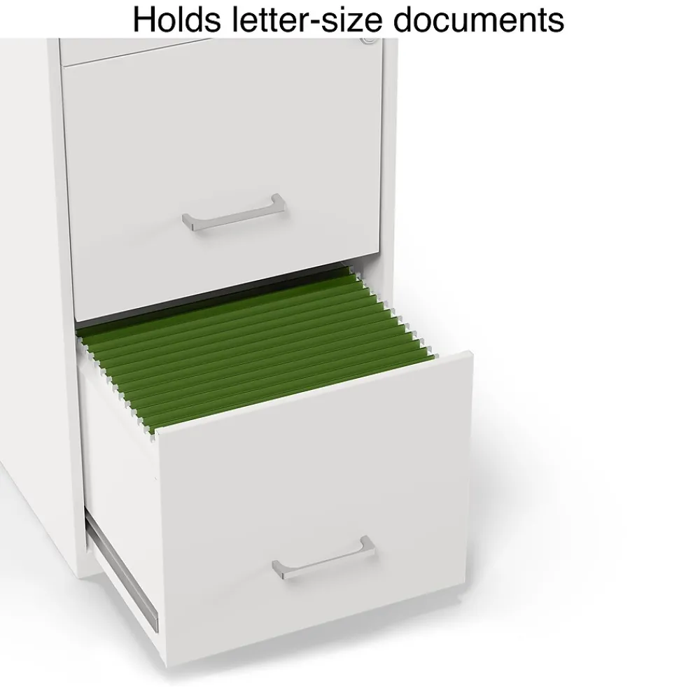 Get a space-efficient solution to recordkeeping and document storage with this three-drawer light duty vertical file cabinet. Ideal for organizing offices, the top drawer provides space for storing supplies, and the bottom two drawers accommodate a large number of letter-size files. The compact design lets this cabinet fit in small spaces, while the white finish and polished handles enhance office decor. This utility file cabinet keeps stored items secure with a built-in lock.