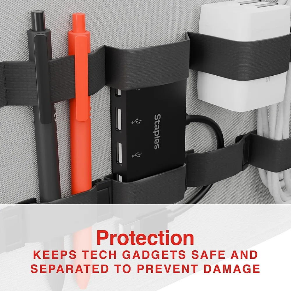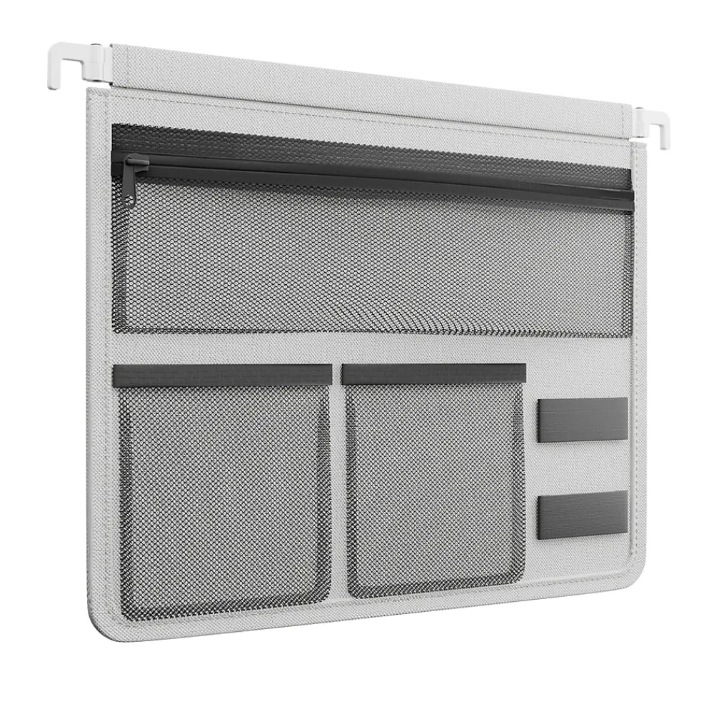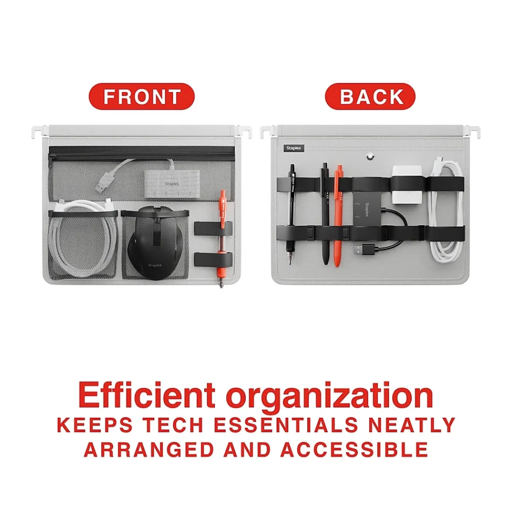 Easily organize your tech essentials with the Staples File Cabinet Tech Organizer, designed to maximize filing cabinet space while keeping your gadgets artfully arranged and easily accessible. The organizer seamlessly integrates into both vertical and lateral filing cabinets. The spacious main pocket, secured with a magnetic clasp, safely holds tablets or small laptops, while elastic loops and straps keep cables, chargers, and adapters organized and tangle-free. A zippered mesh pocket provides visibility for small items, while two additional pockets offer versatile storage options. Perfect for professional or home office use, this organizer helps maintain a clutter-free workspace while ensuring your tech essentials are always protected and within reach.