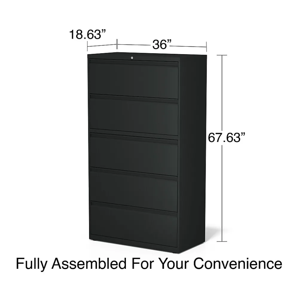 Keep paperwork organized with this lateral file cabinet. Five spacious drawers offer ample storage for forms, reports and other important paperwork, and the ball-bearing slides help drawers open and close smoothly. The mechanical interlock system prevents multiple drawers from opening simultaneously for added safety. An extra-tall top drawer provides convenient storage for binders, file wallets and other document filing essentials. This five-drawer cabinet boasts sturdy metal construction and a baked enamel finish for long-lasting durability.