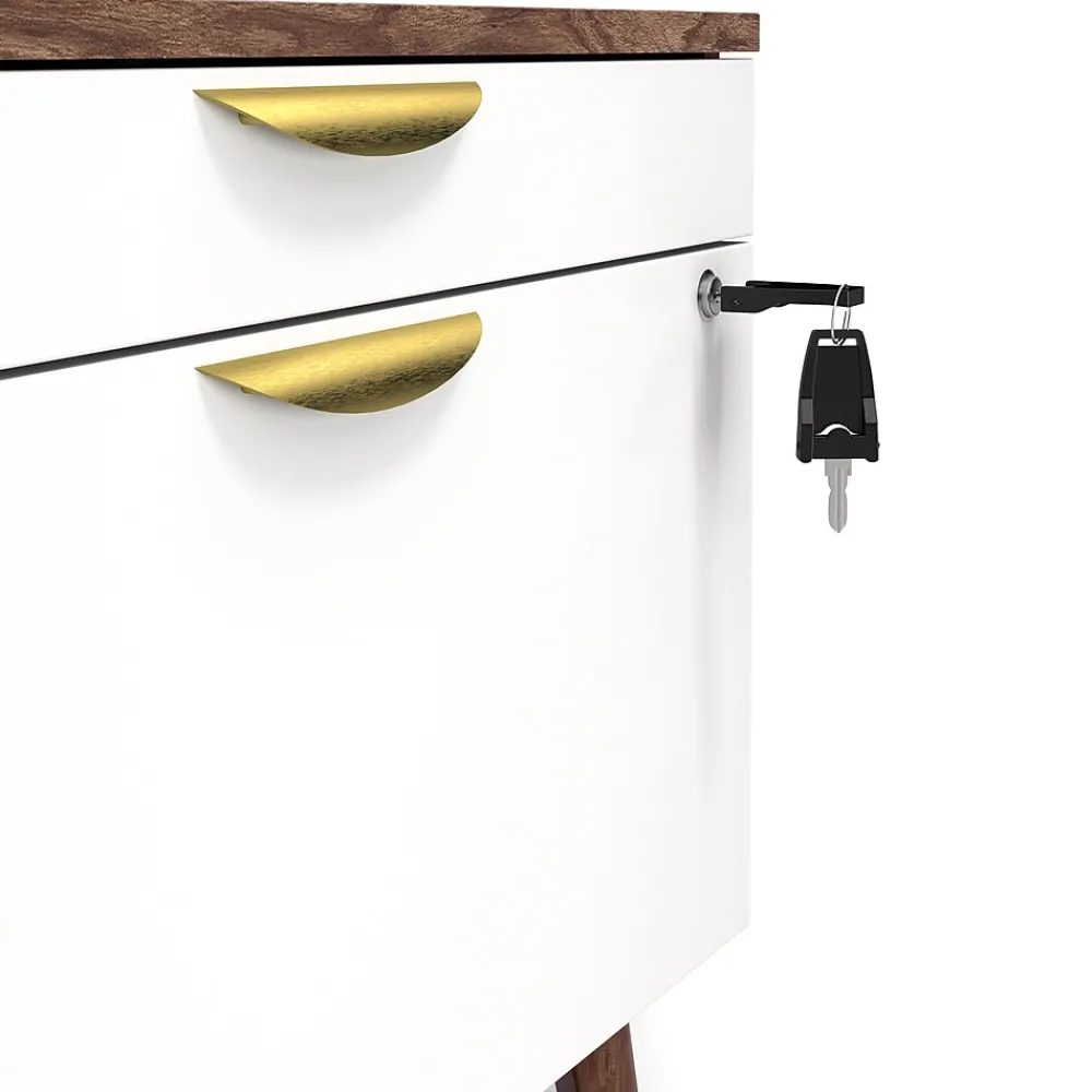 Arrange reports, invoices and other documents neatly inside this lateral file cabinet. A full-width box drawer offers ample storage for spare file folders, notepads and other supplies, while the spacious file drawer accepts letter and legal document sizes for versatile filing options. This file cabinet comes with a keyed lock and two included keys to secure important paperwork when you’re not at your desk. With a simple silhouette, this Union & Scale™ MidMod lateral file cabinet brings understated style to your workspace.
