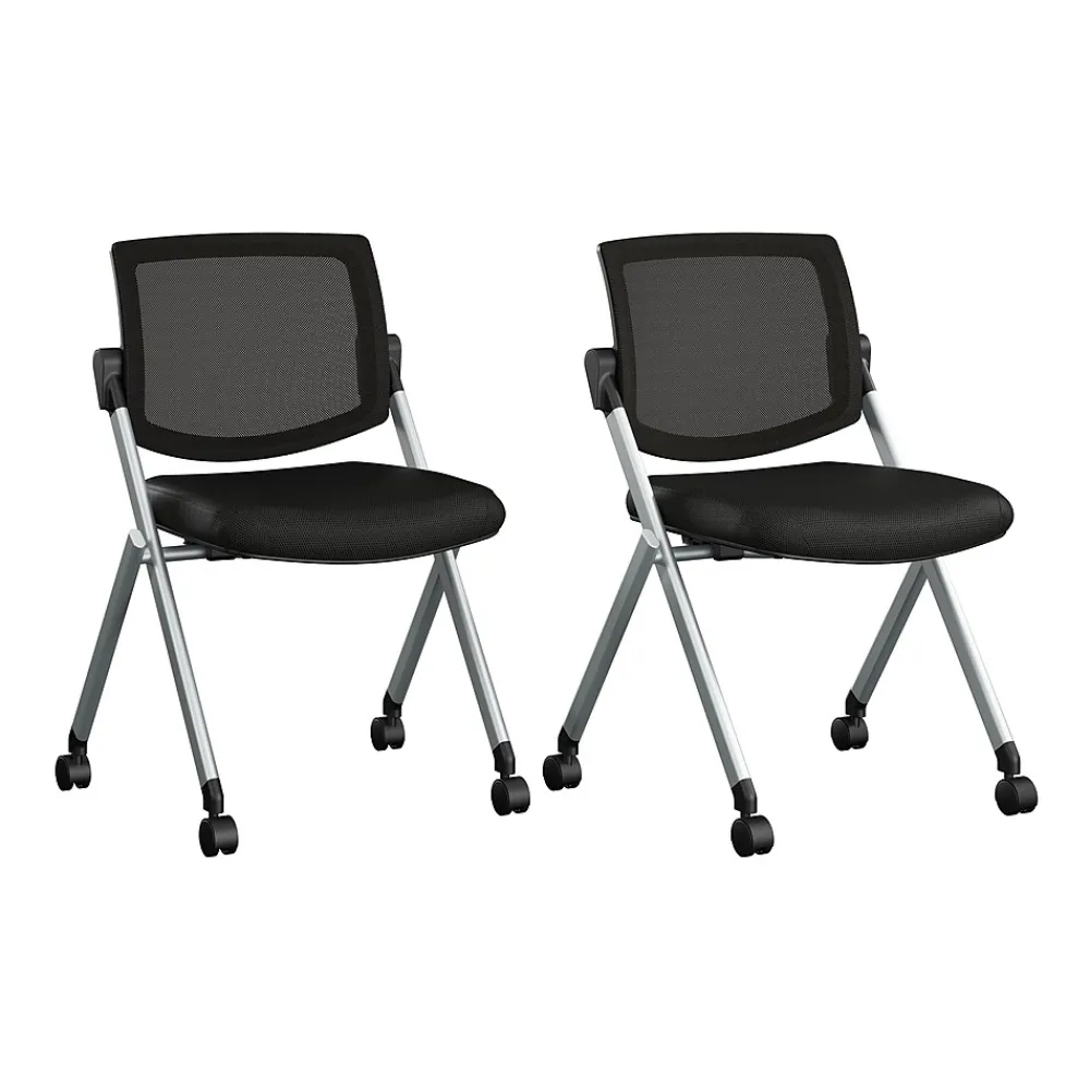 Enhance your meeting space with the Bush Business Furniture Envision Mesh Back Folding Chairs – Set of 2, designed for comfort and versatility, folding neatly away when not in use to save valuable space. The cushioned seat with lightweight black mesh upholstery offers long-lasting comfort with modern style. Simple, durable design is perfect for an office, conference center, training room, school or place of worship. Dual-wheeled casters allow the office chair set to be set up and rearranged at a moment’s notice. Steel frame provides structural strength with a weight capacity of 275 lbs., while the cushioned seat measures 18W x 18D. Bush Business Furniture’s commitment to safety includes rigorous testing that meets or exceeds ANSI/BIFMA 5.5 commercial test standards. Backed by a 5 Year Manufacturer’s Warranty.