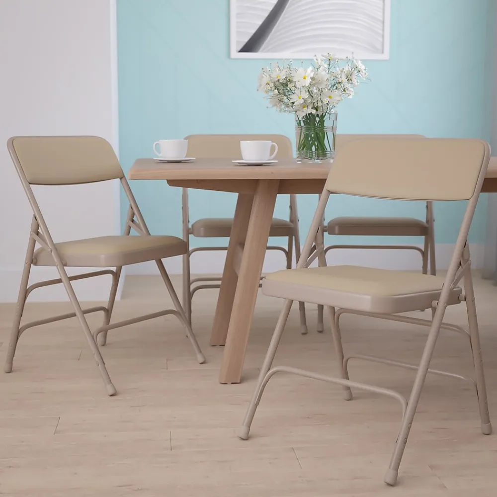 Flash Furniture HERCULES™ Series beige metal folding chair sold as 4 per pack is made of curved triple braced steel frame to strengthen the seat. Chair with vinyl upholstered seat and back folds easily to reduce storage space.