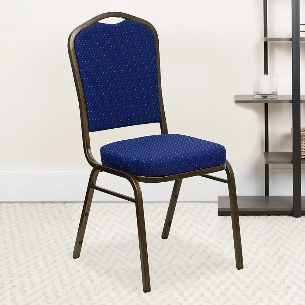 Flash Furniture HERCULES™ Series crown back navy blue fabric banquet chair sold as 4 per pack & is constructed from tough & long lasting 16 ga steel frame with beautiful gold vein powder finish. Chairs are is stackable up to 14 to organizing space.