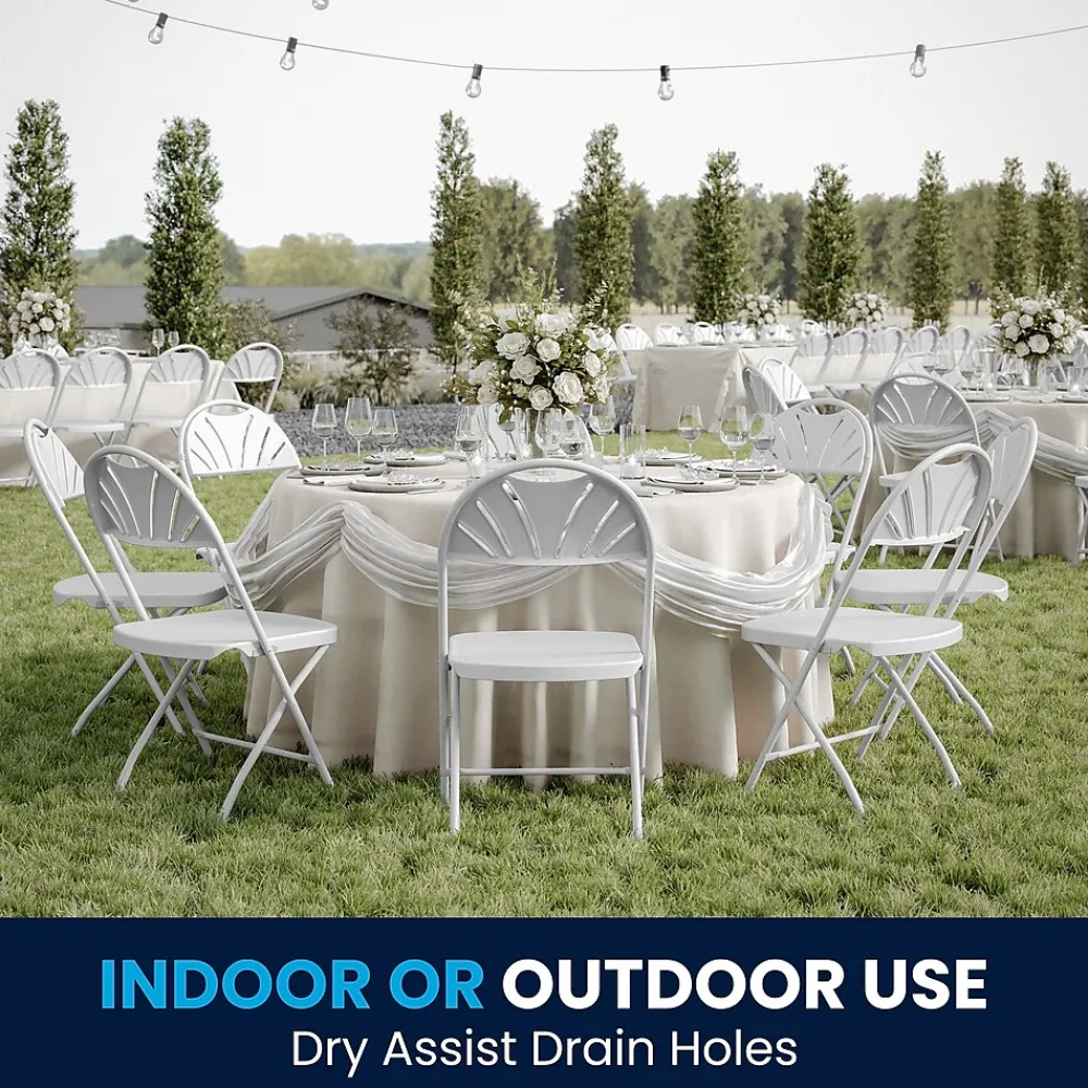 Flash Furniture HERCULES™ Series 800 lbs white folding chair sold as 40 per pack features powder finish thick steel frame and double rails for added strength. Non-marring caps protect floor from scratches. Easy to handle and stack.