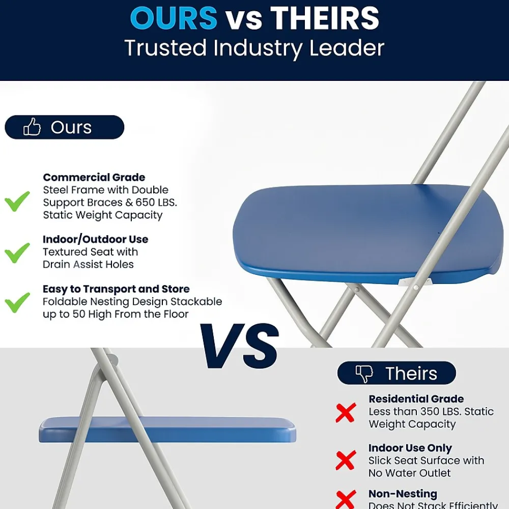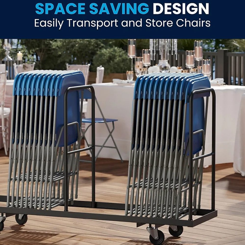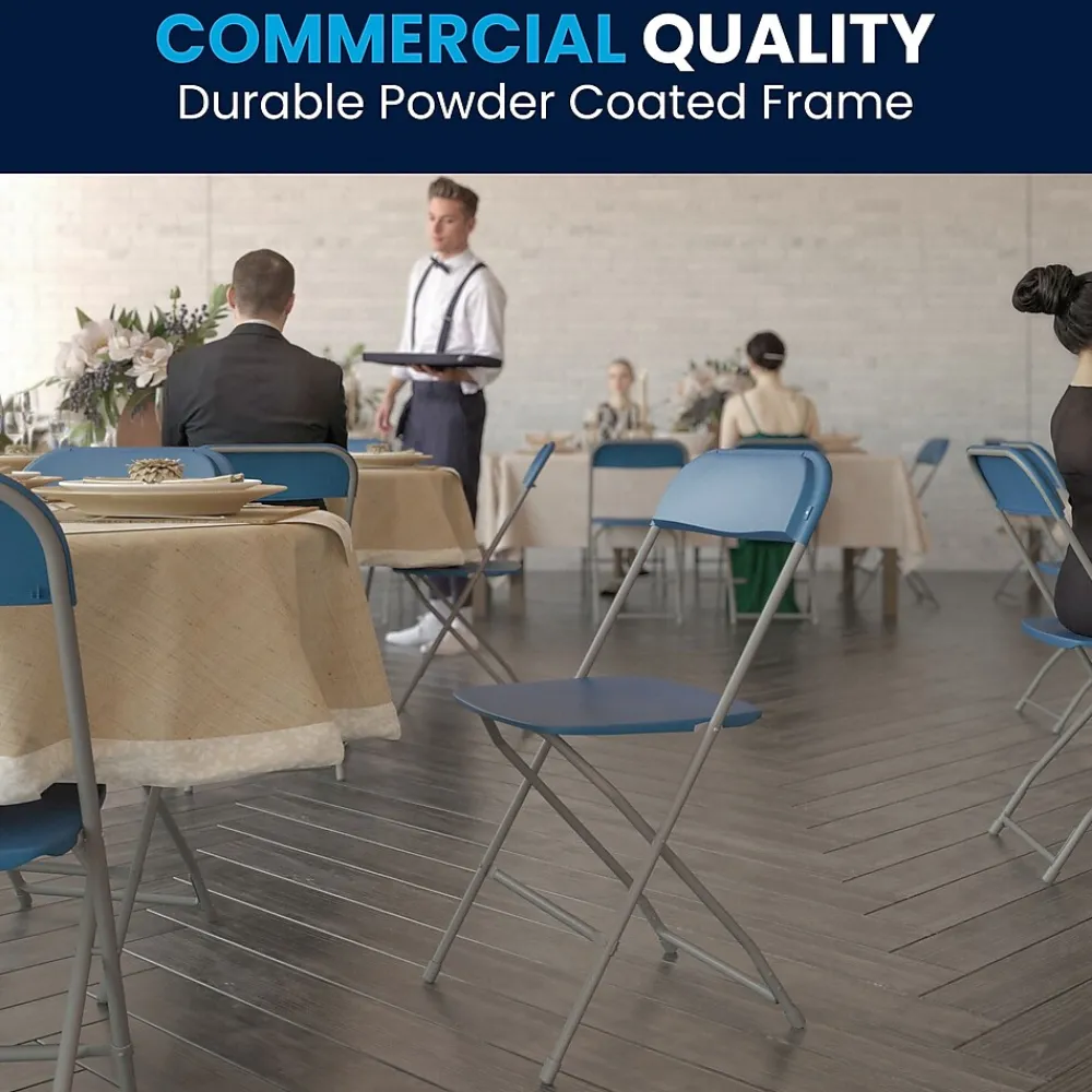 Commercial-grade plastic folding chairs designed to be lightweight but durable. This product is engineered and built with premium materials that will withstand heavy duty use for event, business and home usage. These folding chairs will nest easily to stack 50 high from the floor and feature a textured contoured plastic seat for the highest level of comfort and security. With a variety of color options you can choose what would best pair with your event needs. This is a commercial-grade on-demand seating solution convenient for weddings, school functions, barbecues, game night, and catering events. Stay comfortable during social events with the gentle contour shaped seat and back. Folding chair highlights: – Ready-to-use with no assembly required – Hassle free stackable storage – Textured seat designed for maximum comfort and security – Floor caps to prevent surface and flooring damage – 650LB weight capacity These low-maintenance party event chairs wipe down easily after luncheons and stack neatly for storage or floor maintenance. Make a smart investment by purchasing multiple plastic folding chairs for your rental business, waiting room or corporate training rooms. Purchase our folding chair truck for quick and easy set up and take down.