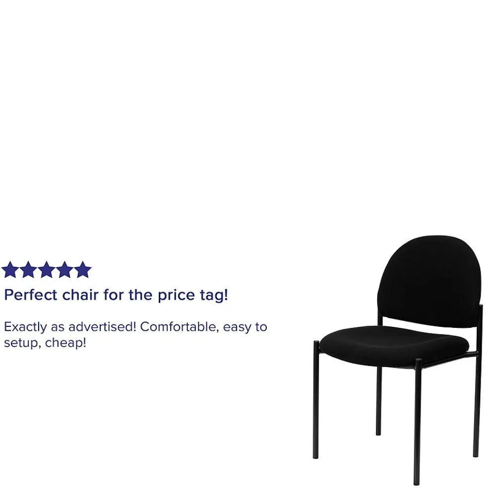 If you must keep clients waiting, give them somewhere they can relax with this side reception chair. Ideal for anyone who wants an extra seating option in their home or for an event, this comfortable chair will bring a big presence to your lobby area without overcrowding your space. The sturdy steel tubing comes in a stylish black finish that fits neatly into most decor settings. This chair features a thick padded, contoured seat and protective floor glides. A powder-coated tubular steel frame ensures durable, long-lasting use. For additional convenience, up to five chairs can be stacked on top of each other, allowing for expedited clean-up or set-up times as well as convenient storage when not in use.