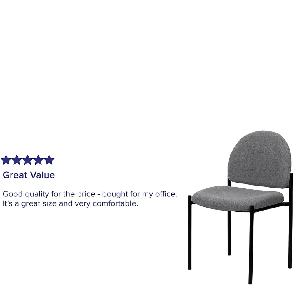If you must keep clients waiting, give them somewhere they can relax with this side reception chair. Ideal for anyone who wants an extra seating option in their home or for an event, this comfortable chair will bring a big presence to your lobby area without overcrowding your space. The sturdy steel tubing comes in a stylish black finish that fits neatly into most decor settings. This chair features a thick padded, contoured seat and protective floor glides. A powder-coated tubular steel frame ensures durable, long-lasting use. For additional convenience, up to five chairs can be stacked on top of each other, allowing for expedited clean-up or set-up times as well as convenient storage when not in use.
