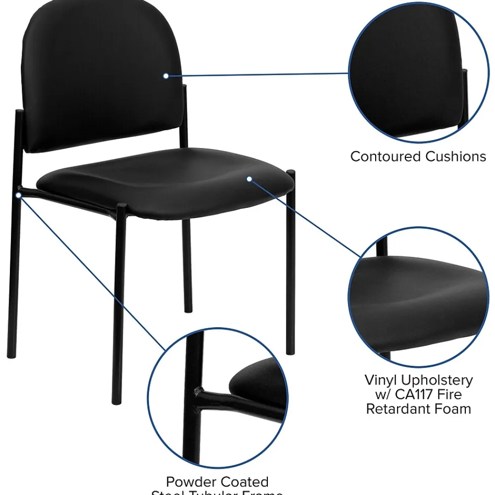 If you must keep clients waiting, give them somewhere they can relax with this side reception chair. Ideal for anyone who wants an extra seating option in their home or for an event, this comfortable chair will bring a big presence to your lobby area without overcrowding your space. The sturdy steel tubing comes in a stylish black finish that fits neatly into most decor settings. This chair features a thick padded, contoured seat and protective floor glides. A powder-coated tubular steel frame ensures durable, long-lasting use. For additional convenience, up to five chairs can be stacked on top of each other, allowing for expedited clean-up or set-up times as well as convenient storage when not in use.