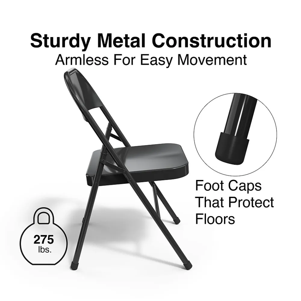 Create seating for meetings, events, or other gatherings with these black folding chairs. The sturdy metal construction offers added durability, while the covered foot caps protect floors against scratches and scuffs. The simple design coordinates with a range of furnishings, making these chairs a versatile addition to your business. Each chair folds away and stacks neatly for convenient storage. With curved seat backs and integrated foot rails, these Staples metal folding chairs offer added support for long hours of use.