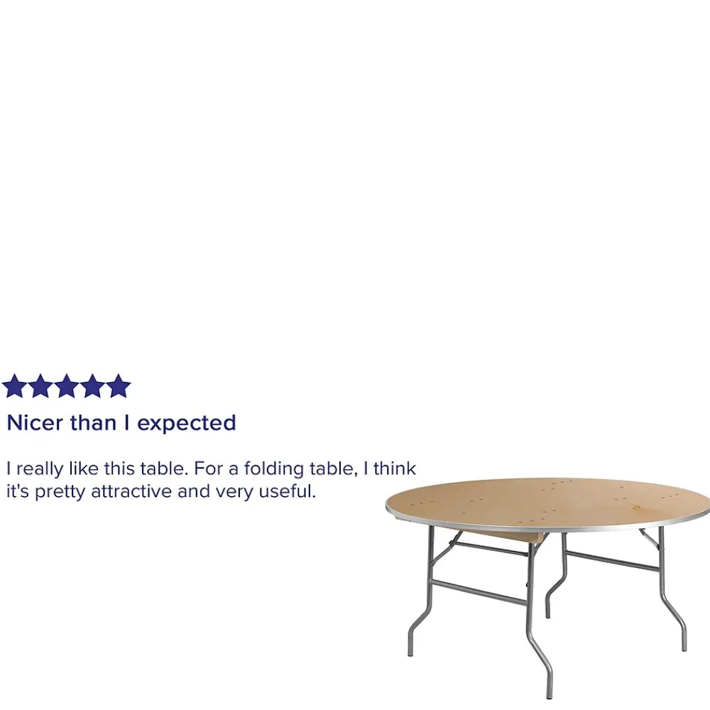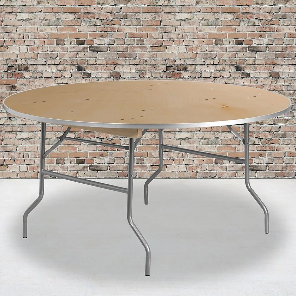 If you want a table that is sturdy, long-lasting and great at a party this heavy duty folding table is as good as it gets! This 60″ Round Folding Table has a .75″ thick plywood top and features an extremely durable Birchwood, hardwood surface with thick aluminum metal edging. This folding table is certain to withstand the test of time. Two extra-wide bolted wood runners are fastened to the underside and designed to allow for safe table stacking. The runners are secured to the table tops with flush fitting, flat head bolts and locking nuts. The heavy duty locking wishbone legs are constructed of 1″, 15 gauge tubular steel and commercial grade powder coating. This is a particularly good choice for party rental companies and other organizations that hold many events throughout the year.