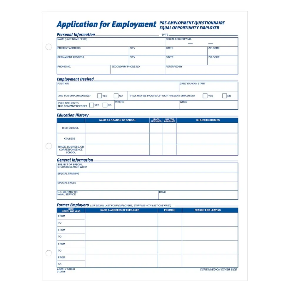 Make applying for employment simple by using these letter-size employment application forms. Each one is printed in English for convenience, while the three-hole-punched edge lets you conveniently insert them into any standard three-ring binder. These Adams employment application forms comply with all legal requirements and have 50 sheets per pad, so stocking up is easy.