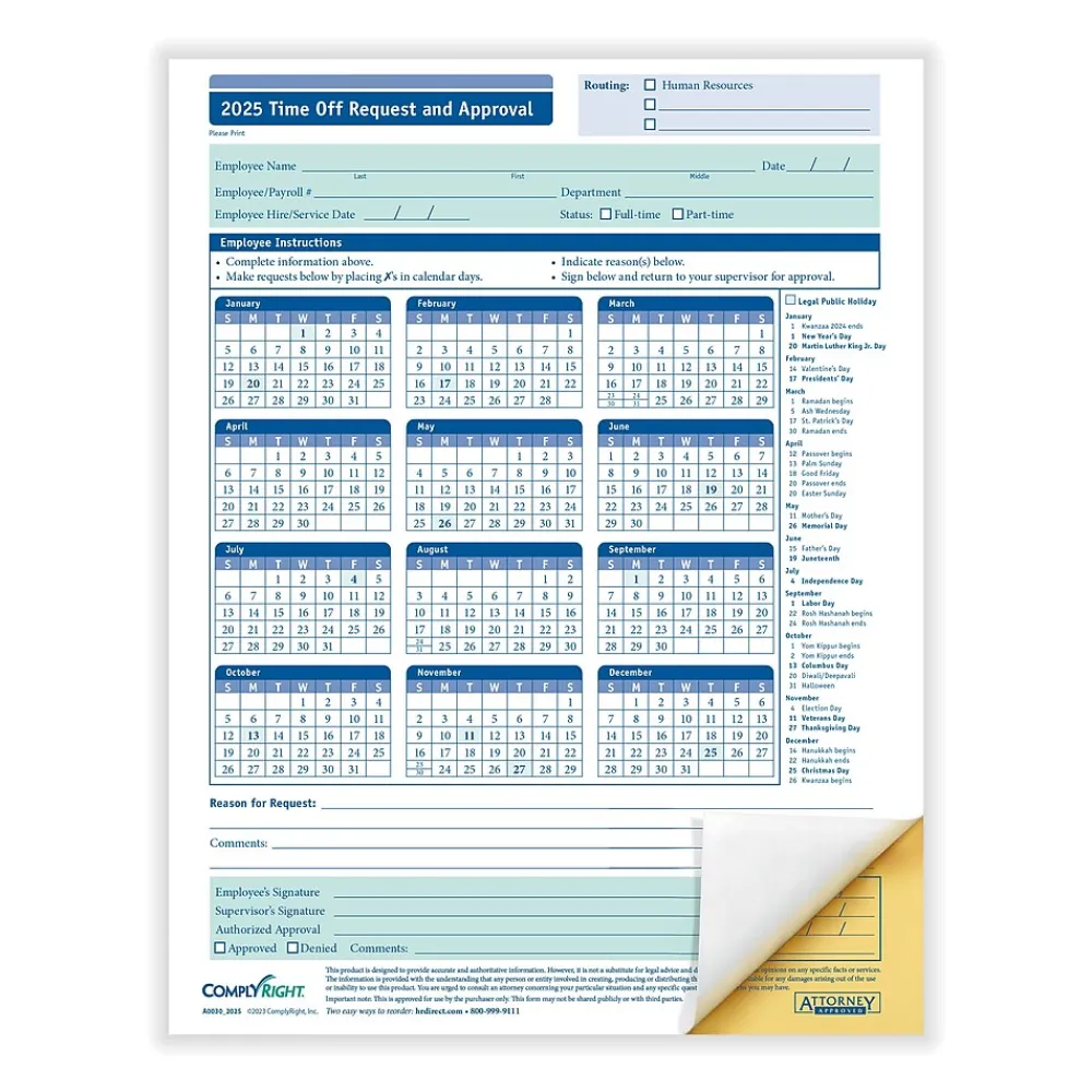 The Time Off Request and Approval form utilizes an efficient calendar format, to show time off requests for a full year. This effective format allows employees to clearly mark the days they want off, and from there, managers can quickly review and approve the requested days. The use of this form helps to create a consistent process across your business. The 2-part format allows you to keep a copy for your records and provide one to the employee for theirs.
