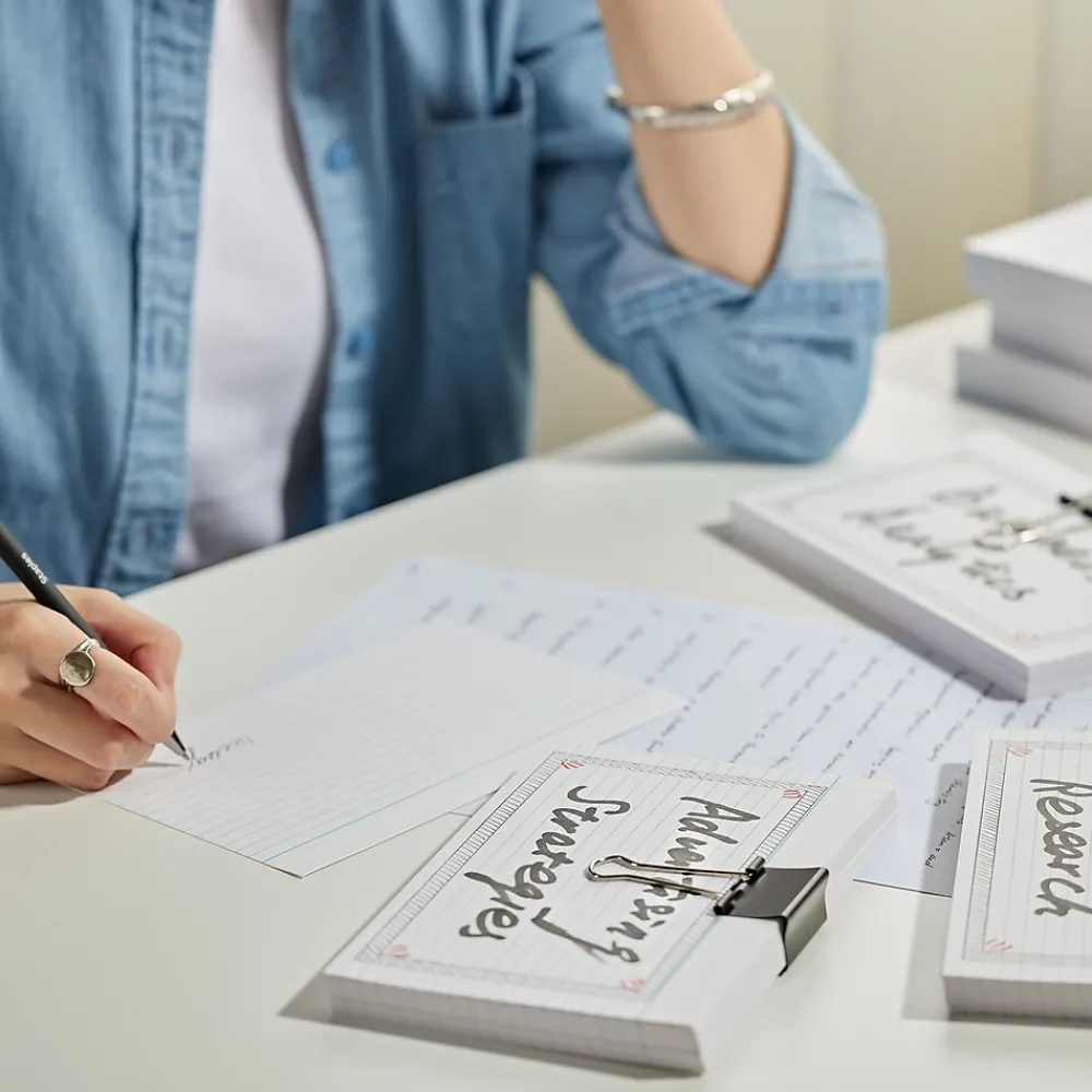 Organize your thoughts with these index cards. The heavyweight construction stands up to frequent handling, while the large size and line ruling provide ample room for writing. With 100 pieces in each pack, these Staples Business Essentials 5 x 8-inch heavyweight line-ruled index cards offer a handy way to keep your desk stocked.
