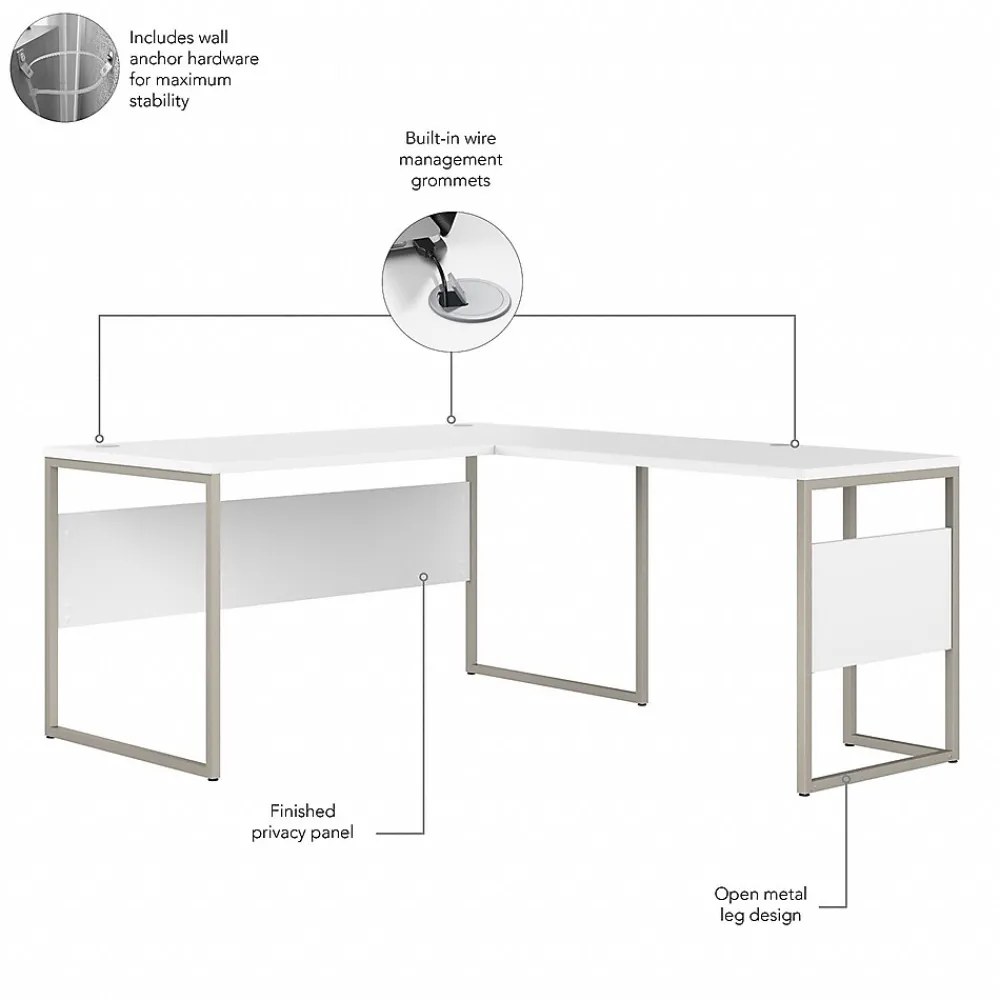 The Bush Business Furniture Hybrid L-shaped table desk blends a durable work surface with sturdy metal legs to offer a stylish, long-lasting solution for the modern professional. Tackle your next project or assignment with a computer, books, and more on a desktop that supports up to 200 lbs. Three built-in wire management grommets keep cords and cables in order, so your work area remains free from unnecessary clutter. The corner desk’s open leg design and finished privacy panel allows it to look great facing any direction in a home or professional office environment. This modern computer desk has been meticulously tested to meet or exceed the ANSI/BIFMA standards for safety, durability, and performance and is backed by a 10-year manufacturer warranty. American-made with US and imported parts.
