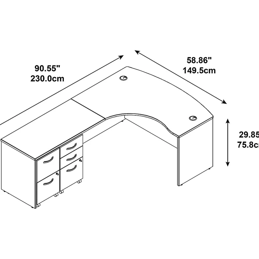- Bundle Includes: 60W x 43D Left Hand L-Bowfront Desk, 48W Return Bridge, 3-Drawer Mobile Pedestal, and 2-Drawer Mobile Pedestal