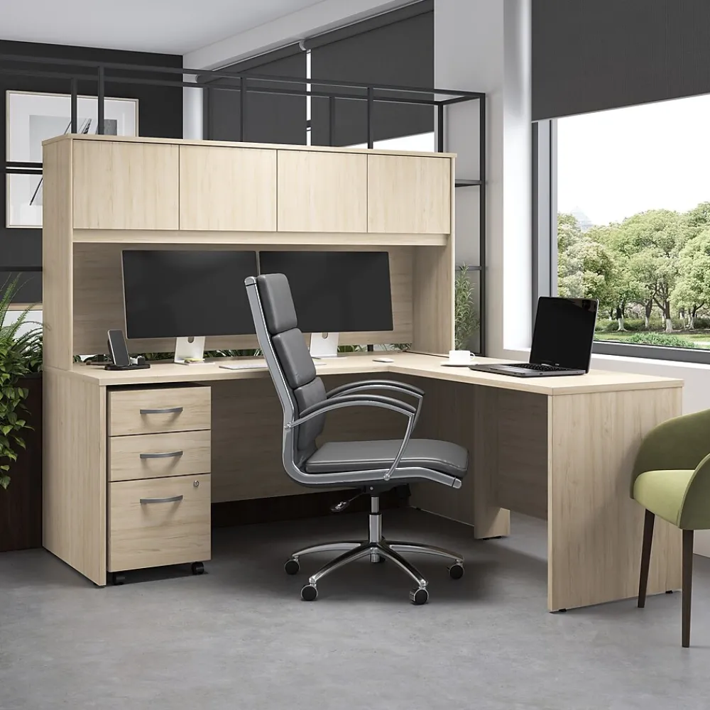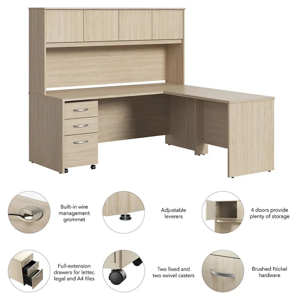 Choose this Bush Business Furniture Studio C L Shaped Desk with Hutch and Mobile File Cabinet for a comfortable design that works with you for years. The thermally fused laminate finish, durable edge banding and sturdy end panels resist scratches, stains and dents while standing up to the rigors of a 40-plus hour work week. The 42W Return attaches to either side of the 72W Desk to form a left or right handed L Shaped layout. With 4 doors featuring self-closing Euro-style hinges, the Hutch conveniently stores office supplies, books and more. The 3 Drawer File Cabinet rolls throughout your office or remains in place as needed on any surface. One file drawer accepts legal, letter and A4-size paperwork while two box drawers organize supplies. This desk with storage set comes with a 10 Year Warranty and meets ANSI/BIFMA quality test standards. American made with U.S. and imported parts.