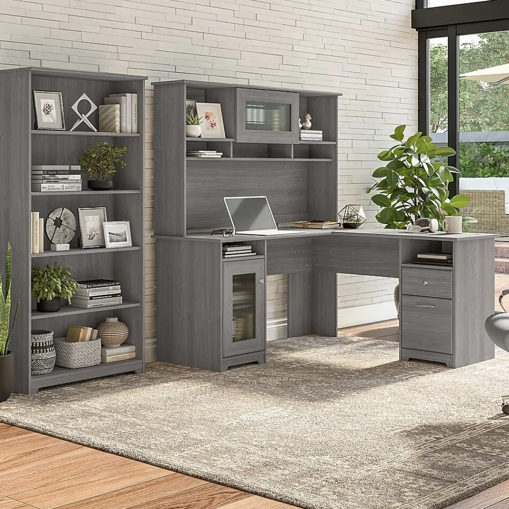 The Bush Furniture Cabot 60W L Shaped Computer Desk with Hutch and 5 Shelf Bookcase presents a home office solution with transitional style. The L Shaped Desk surface supports up to 200 pounds and includes built-in wire management to keep cords and cables out of the way. Organize materials inside a storage cabinet with an adjustable shelf while using the file drawer and box drawer to keep paperwork and office supplies close by. The Desk Hutch adds another closed compartment behind a fluted glass door along with right and left shelves for flexible storage and display. The Tall Bookcase includes three adjustable shelves to accommodate books and decorations of various sizes while two shelves are fixed for stability. This corner desk with bookshelf and hutch has been rigorously tested to meet or exceed ANSI/SOHO quality standards for safety and performance and is backed by a 1 Year Warranty.