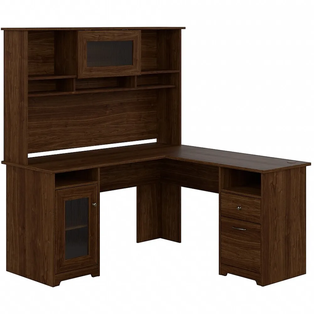The Bush Furniture Cabot 60W L Shaped Computer Desk with Hutch and Storage presents a home office solution with transitional style. The spacious L Shaped Desk surface supports up to 200 pounds and includes built-in wire management to keep cords and cables out of the way. Organize materials and supplies inside a storage cabinet that contains one adjustable shelf. The file drawer opens on smooth full-extension ball bearing slides for an effortless reach to letter, legal, and A4-size paperwork while a smaller box drawer keeps small office supplies in order. The Desk Hutch adds another closed compartment behind a fluted glass door along with right and left shelves for flexible storage and display. This corner desk with drawers, storage cabinet, and hutch has been rigorously tested to meet or exceed ANSI/SOHO quality standards for safety and performance and is backed by a 1 Year Warranty.