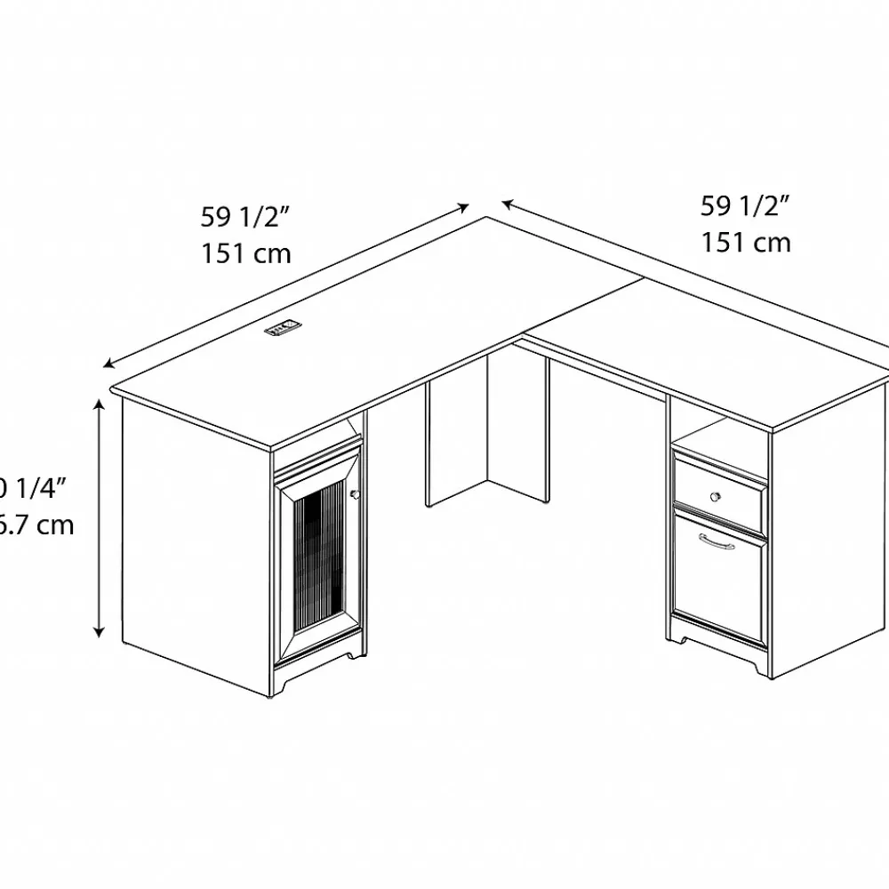 The Bush Furniture Cabot 60W L Shaped Computer Desk offers a spacious and efficient workspace for your home office. Enjoy a beautiful traditional look with smart features for your convenience. The L Shaped Desk design provides a large, durable work surface and just the right amount of storage to keep you feeling neat and organized. Storage details include an enclosed cabinet with a stylish fluted glass door and a box drawer for supplies. A file drawer opens on smooth full-extension ball bearing slides for an effortless reach to letter, legal or A4 sized paperwork. A built-in 4-port USB hub keeps your devices connected. The corner desk design saves space but provides you with 60 inches to spread out in either direction. This home office desk with storage is tested to meet ANSI/BIFMA standards for safety and performance and is backed by the Bush Furniture 1 Year Manufacturer’s Warranty.