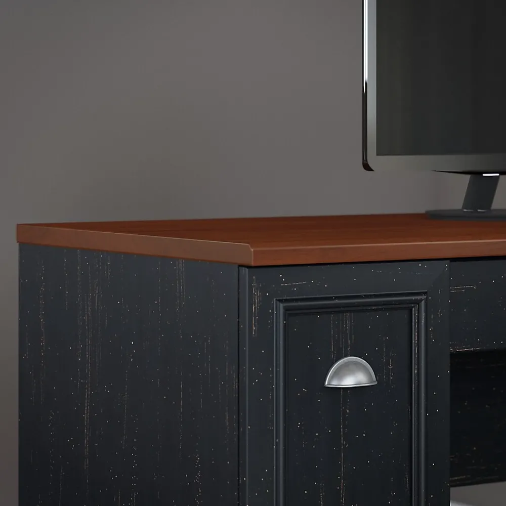 Bring a slice of modern farmhouse styling into your home office with the Bush Furniture Fairview L Shaped Desk. Spread out, surf the net and pay bills on the durable surface, and stash supplies in the box drawer or open storage space. Organize mail in the letter-size file drawer or vertical closed storage area, and store your laptop or keyboard in a drawer with a drop-down front. Antique Pewter hardware adds character to your home office. Attach the Hutch (sold separately) to either side of the L Shaped Desk to fit your needs. Available in attractive Antique Black with Hansen Cherry accents or Antique White with Tea Maple accents, Fairview meets ANSI/SOHO quality test standards for performance and safety, and comes with a 6 Year Manufacturer’s Warranty. See the full collection for coordinating items available, including the Hutch.