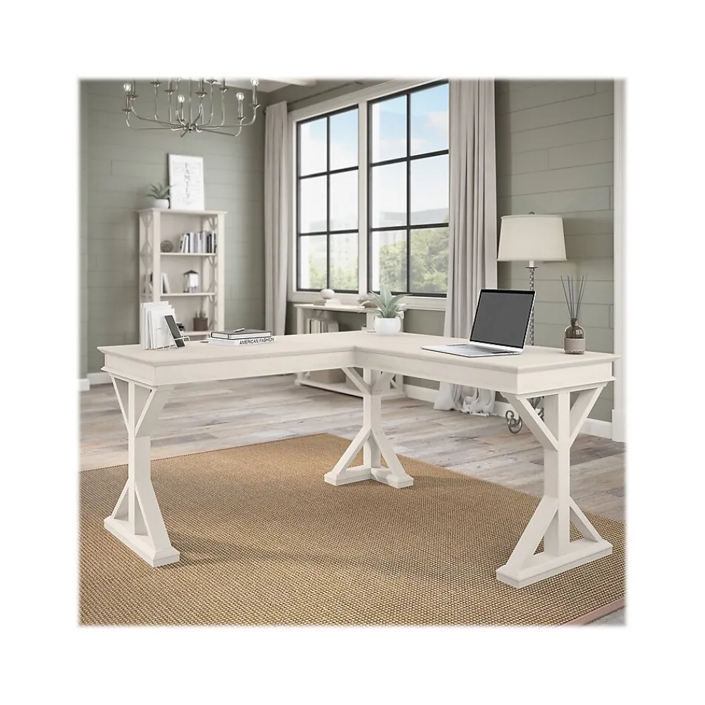The Bush Furniture Homestead farmhouse 60″W L-shaped desk offers a personal workspace solution with appealing farmhouse style. Tackle your next project or assignment with a computer, books, paperwork, and more on a desktop that supports up to 200 lbs. A built-in wire management grommet keeps cords and cables in order, so your work area remains free from unnecessary clutter. Save space in compact areas by placing the L-shaped desk in a corner, or make it your home office’s centerpiece. The computer desk’s trestle leg design and chamfered profile edges give it a casual farmhouse style. This office desk has been meticulously tested to meet or exceed the ANSI/SOHO quality standards for safety, durability, and performance and is backed by a 1-year manufacturer warranty. See the full collection for coordinating items available.