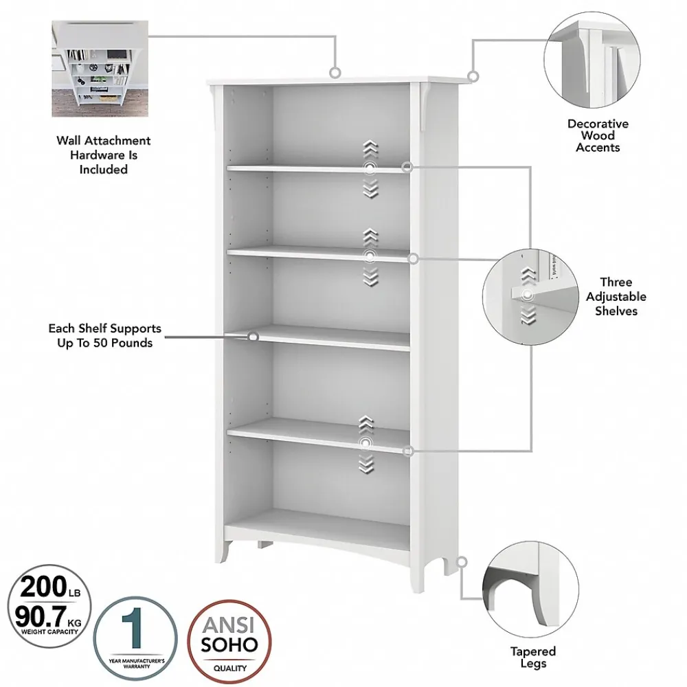 - Bookcase has three adjustable shelves for flexible storage and two fixed shelves for stability