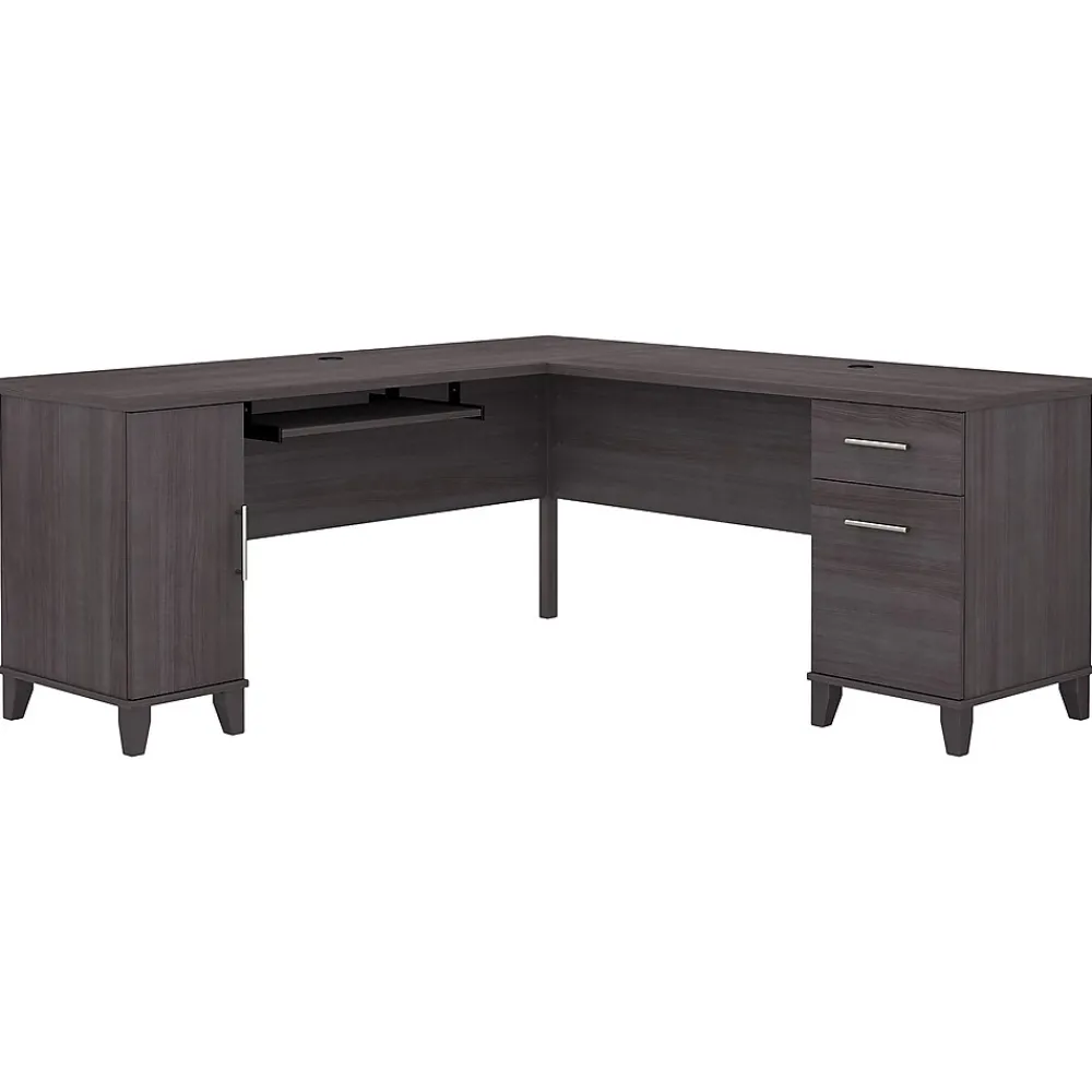 Build your home office around the Bush Furniture Somerset 72″W L-shaped desk with storage, featuring transitional style and plenty of space for materials. Maximize the potential of your home office with this desk. Create your remote work headquarters with space for a computer, phone, printer, and more on a surface that features wire management grommets for keeping cords and cables in order. A convenient pull-out tray provides a perfect place to keep a keyboard or laptop, and the desk also includes a vertical storage cabinet with an adjustable shelf. Place pens, paper, and more in the box drawer, and enjoy a file drawer gliding on smooth ball bearing slides for an easy reach to documents. Transitional styling offers an elegant finish with tapered legs and contemporary metal hardware for an alluring appearance. This desk with storage is tested to meet ANSI/SOHO standards for safety and performance and is backed by the Bush Furniture 6-year manufacturer warranty. American-made with US and imported parts.