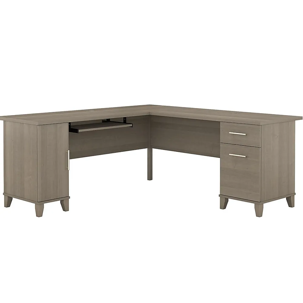Maximize the potential of your home office with the Bush Furniture Somerset 72W L Shaped Desk. Create your remote work headquarters with space for a computer, phone, printer and more on a surface that features wire management slots for keeping cords and cables in order. A convenient pull-out shelf provides a perfect place to keep a keyboard or laptop, and the Desk also includes a vertical storage cabinet with an adjustable shelf. Place pens, paper and more in the box drawer, and enjoy a file drawer gliding on smooth ball bearing slides for an easy reach to documents. Transitional styling includes a stylish finish with tapered legs and contemporary metal hardware for an alluring appearance. This quality office desk is tested to meet ANSI/SOHO standards for safety and performance and is backed by the Bush Furniture 6 Year Manufacturer’s Warranty. American made with U.S. and imported parts.