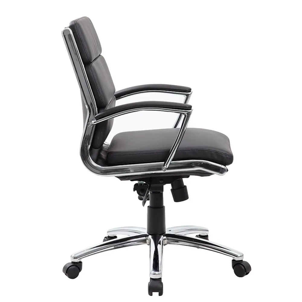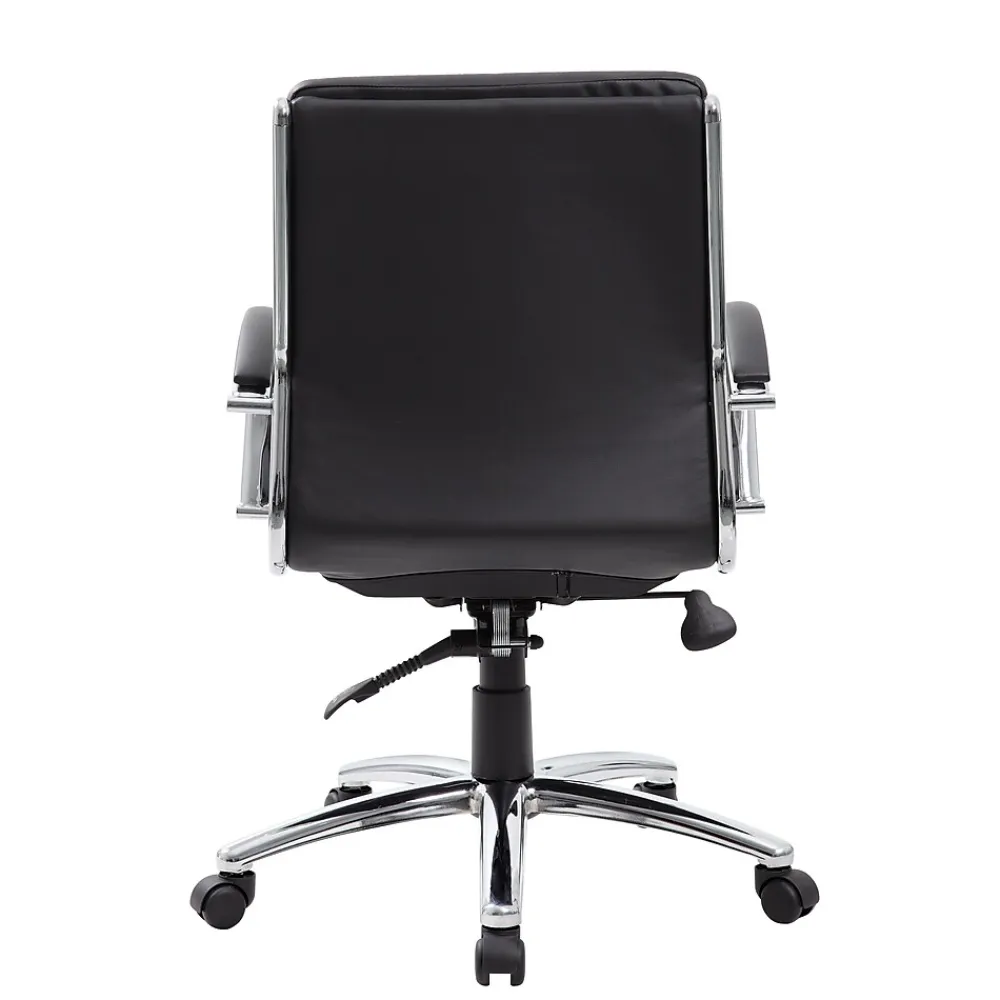 This mid back executive chair is black. This chair features a large 27” chrome base, and metal chrome plated arms topped with soft pads.Pneumatic seat height adjustment and the adjustable tilt tension are controlled by a heavy duty two paddle mechanism.