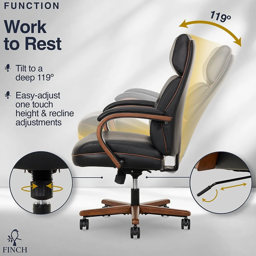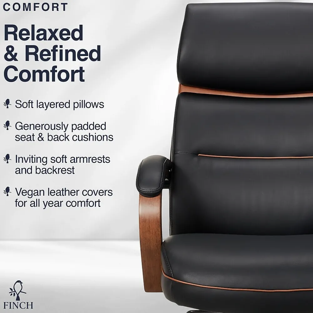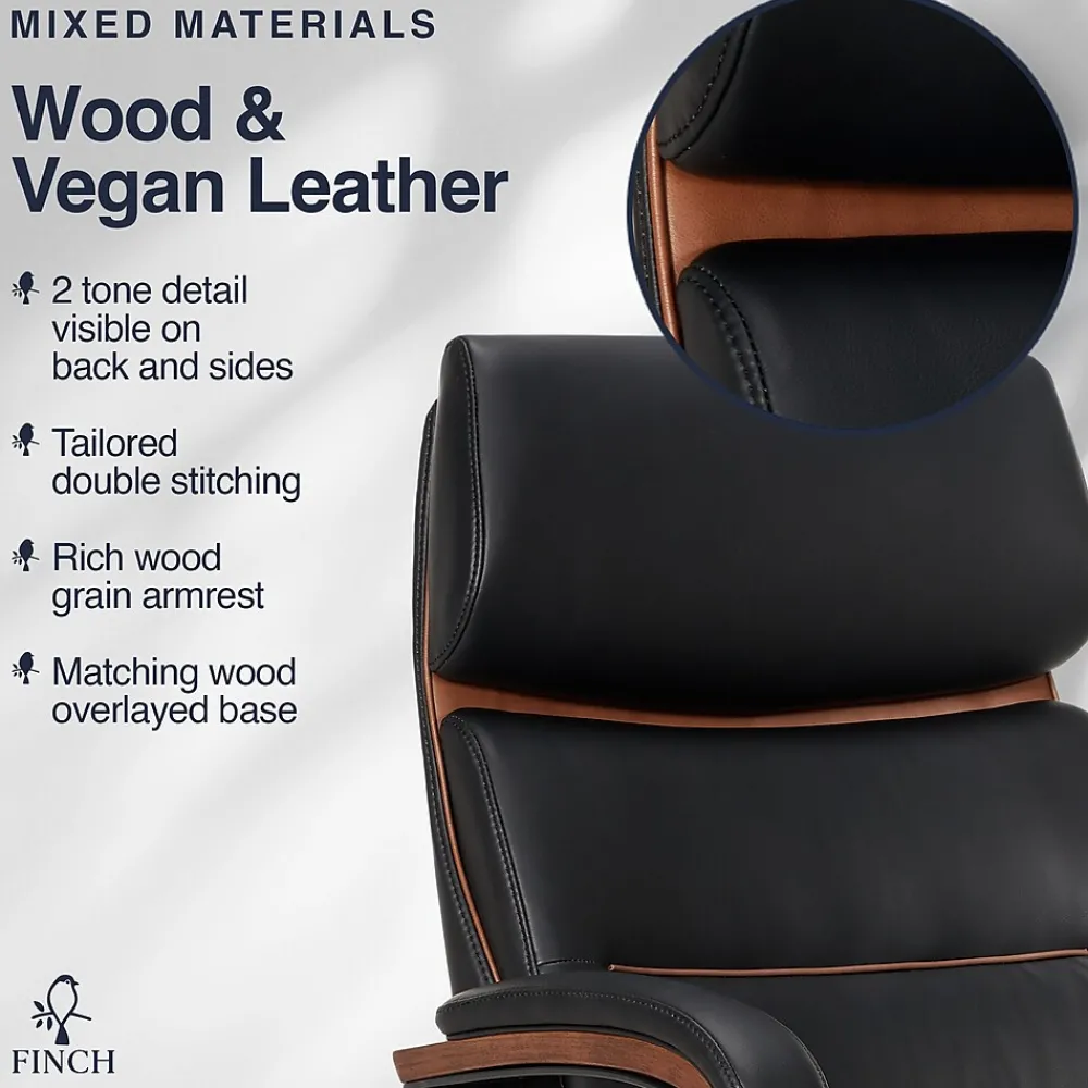 Thank you for considering a Finch branded product. Finch branded products blend styles, materials and deliver practicality. Our products try to be unique, stylish, authentic and always affordable. The Neo Two by Finch is a mid back office chair inspired by the modern forms and generous proportions of classic 1960s designs. Set atop smooth and quietly rolling casters, the padded seat and back – accented with tailored double-stitching – support the body with gentle ergonomic contours that hugs the body. The frame provides a tilt of 119º for a deep stretch that lets you relax with welcoming comfort. Upholstered in supple PU leather with a cognac accent trim on the back and sides, 3 colors in Black, Brown, and Cream contrast the unique texture of the rich wood grain armrests and base for a sophisticated look that lends elegance and practicality. With its subtle curves and shapely silhouette, the Finch Neo Two is a stylish, functional, and contemporary office chair that’ll elevate your workspace in the home, office, or any combination.