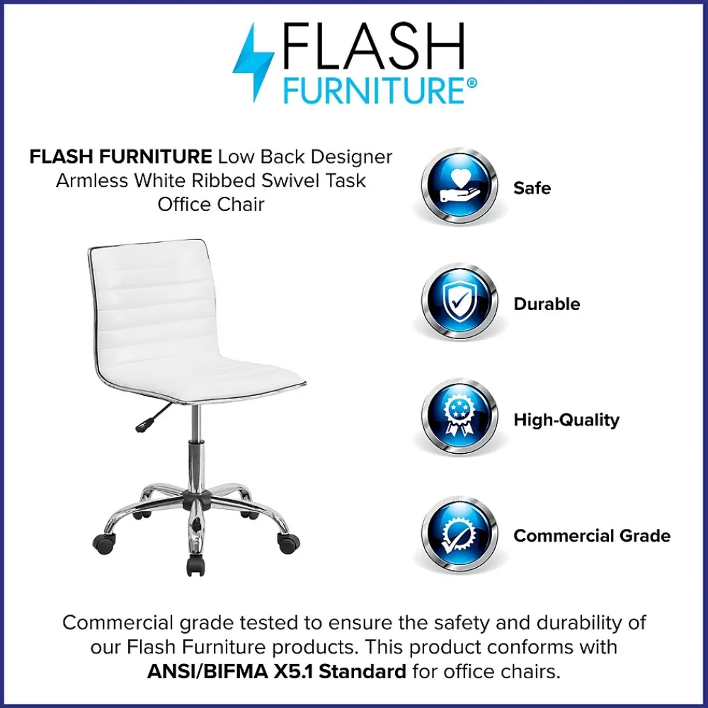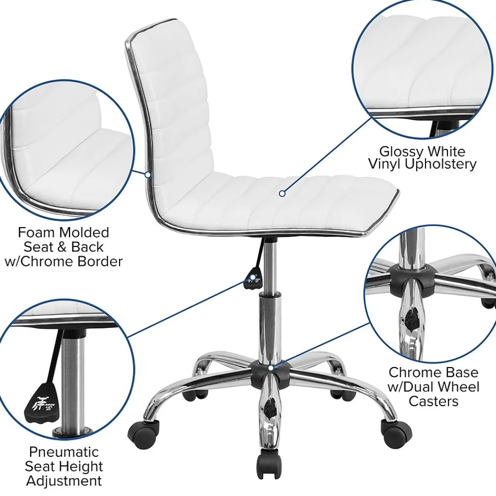 Modern accents and a sleek profile make this ribbed office task chair a perfect addition to your office. A streamlined silhouette combined with the armless design can breathe new life into a small workspace and not only allows room for more board members, clients or visitors but also permits you to roll further under a desk or table. The glossy white vinyl upholstery with a chrome metal border paired with a matching chrome frame and base gives an up-market feel to any professional space. The low back design and foam molded seat and back provide lower back support. A pneumatic seat height adjustment lever lets you easily position the chair while the 360° swivel gives you access to all of your work surfaces. This sturdy task chair has a heavy duty, 5-star chrome base with dual-wheel casters. Spills clean up easily with water followed by a dry cloth.