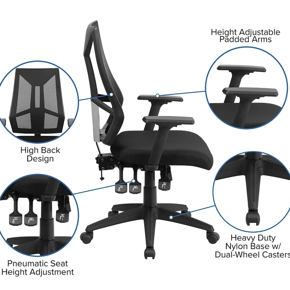 If you’re looking for an easy to adjust office chair, this triple paddle chair is an excellent choice. Mesh office chairs can keep you more productive throughout your work day with its comfort and ventilated design. The locking back angle adjustment lever changes the angle of your torso to reduce disc pressure. The contoured seat dissipates pressure points for greater comfort. The waterfall front seat edge removes pressure from the lower legs and improves circulation. Chair easily swivels 360 degrees to get the maximum use of your workspace without strain. The pneumatic adjustment lever will allow you to easily adjust the seat to your desired height. The adjustable armrests take the pressure off the shoulders and the neck, which minimizes the risk of pain. This comfortably designed computer chair will make a great option for your home or office space.