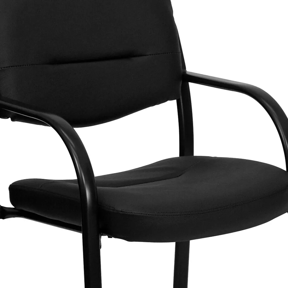 Give guests an attractive seating option with this Flash Furniture executive side chair. The black LeatherSoft upholstery delivers both durability and modern style, while the curved fixed arms offer support for the upper body. This chair features a sled-style base for added stability along with nonskid anti-tilt levers to protect your floor from scratches and scuffs. The black tubular frame and powder-coated finish stand up to everyday use, making this guest chair a perfect option for busy office reception areas. Boasting contoured cushions and an open-back design, this Flash Furniture executive side chair keeps visitors comfortable as they wait for appointments or business meetings.