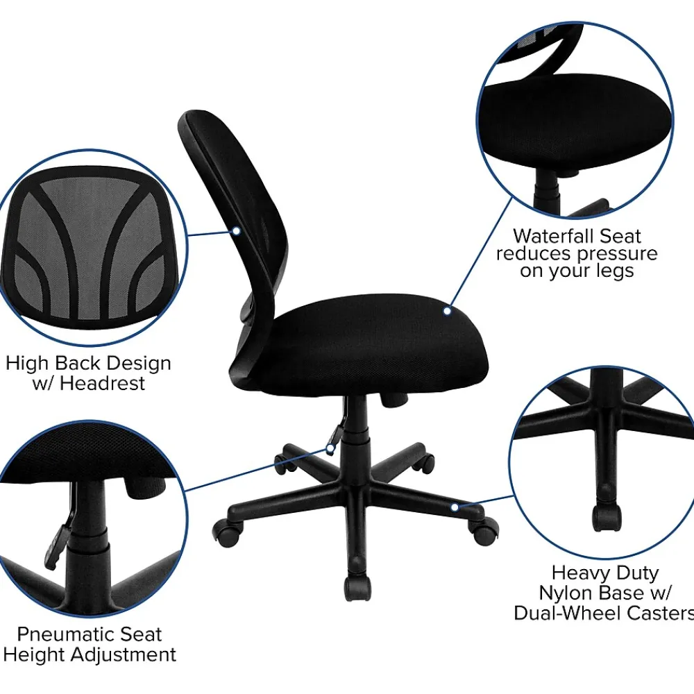Why go when this supremely comfortable task office chair makes you want to stay? The Y-GO task chair features a black mesh back with flex bars which conform to the natural curve of the user’s back. Mesh office chairs can keep you more productive throughout your work day with its comfort and ventilated design. The breathable mesh material allows air to circulate to keep you cool while sitting. The mid-back design offers support to the mid-to-upper back region. The waterfall front seat edge removes pressure from the lower legs and improves circulation. Chair easily swivels 360 degrees to get the maximum use of your workspace without strain. The pneumatic adjustment lever will allow you to easily adjust the seat to your desired height. The flex back with the padded foam seat makes this a valuable addition to any home office, professional office or school business department.