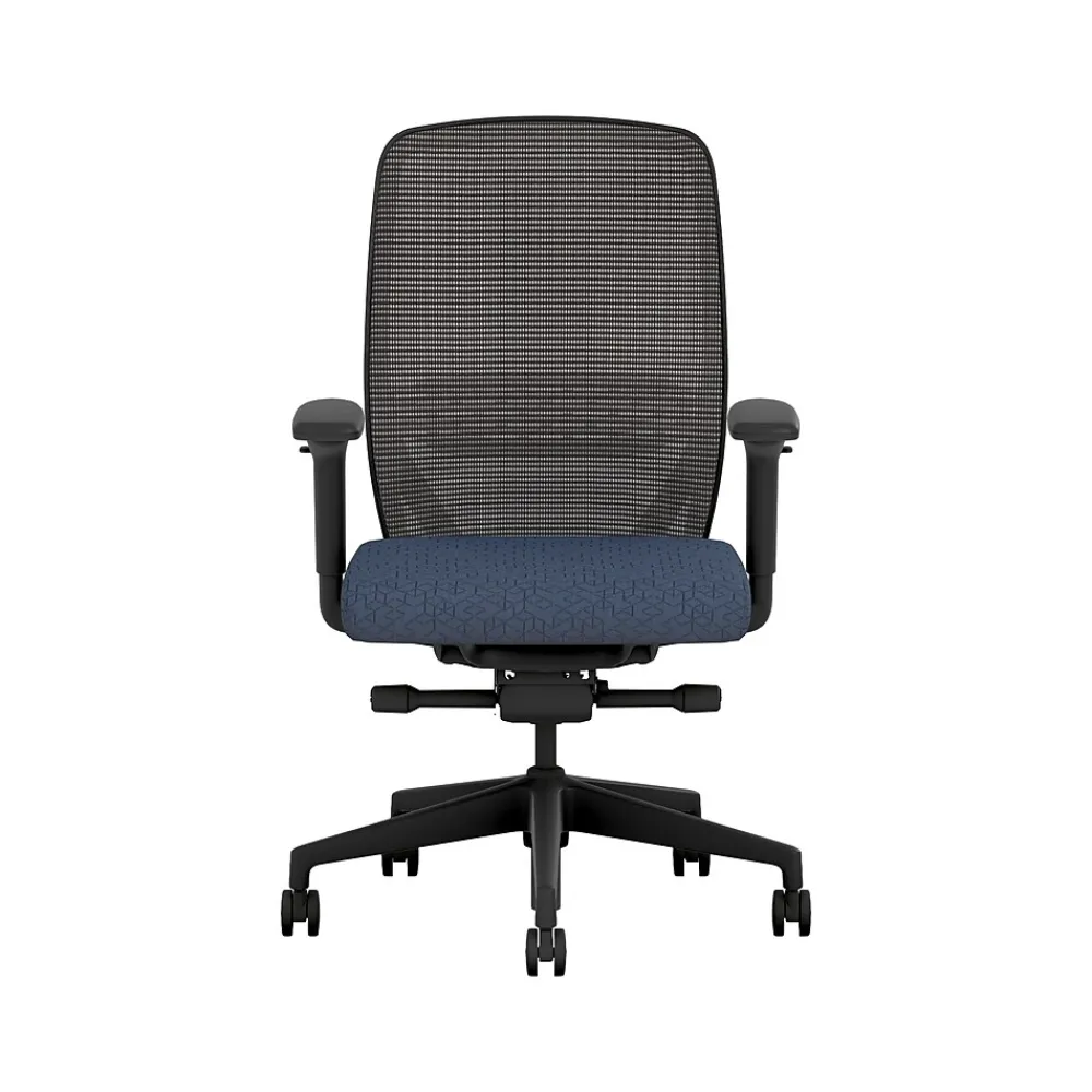 - Four-way stretch mesh back in black, Apex navy fabric seat, and black frame