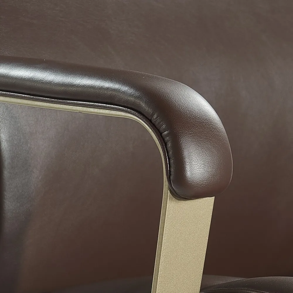 - Brown bonded leather cushioned seat is easy to clean with a damp cloth; smooth-rolling caster base with 360-degree swivel comes in a modern brass metal finish