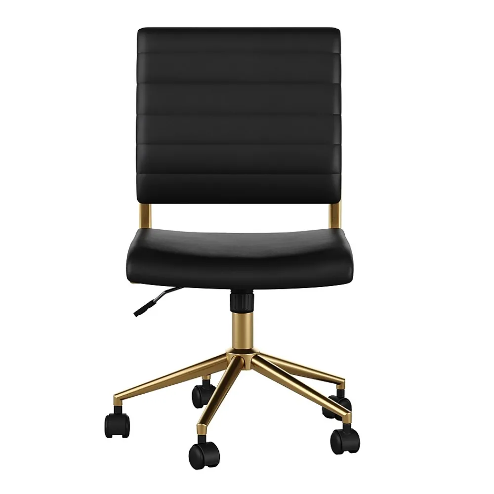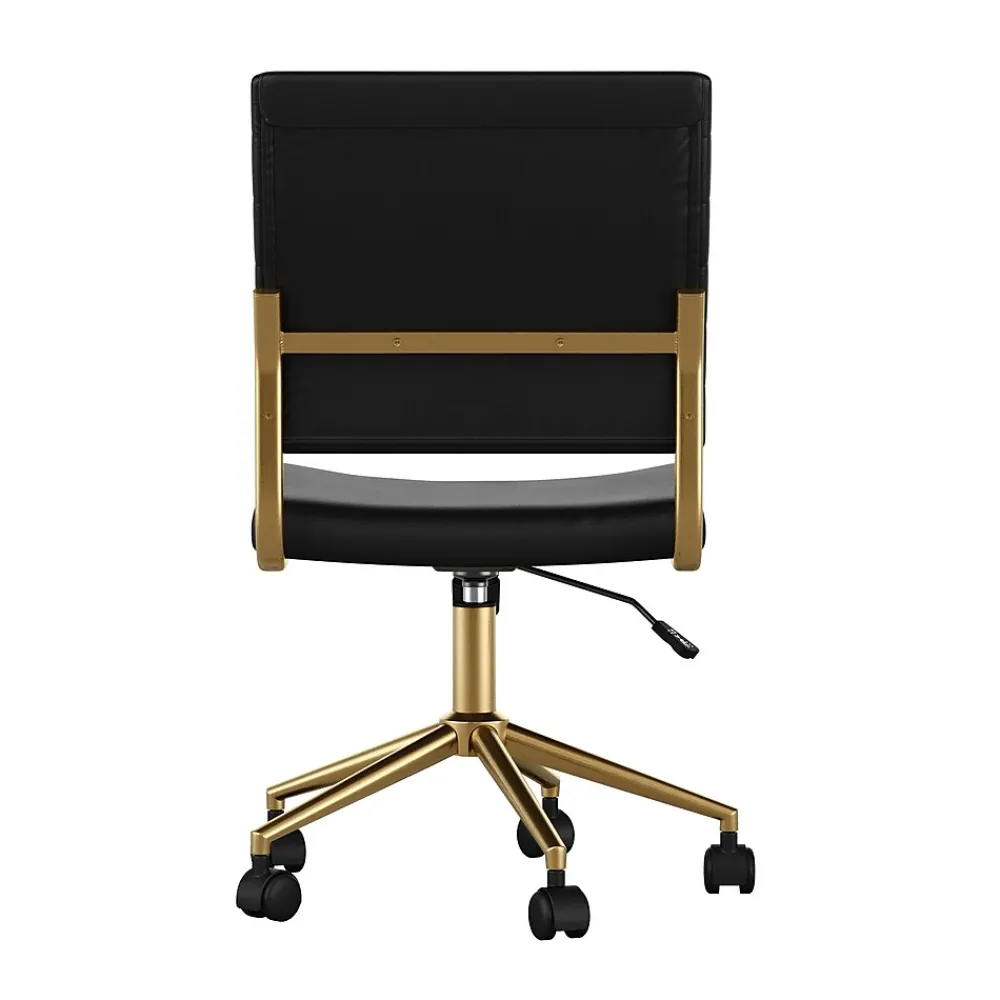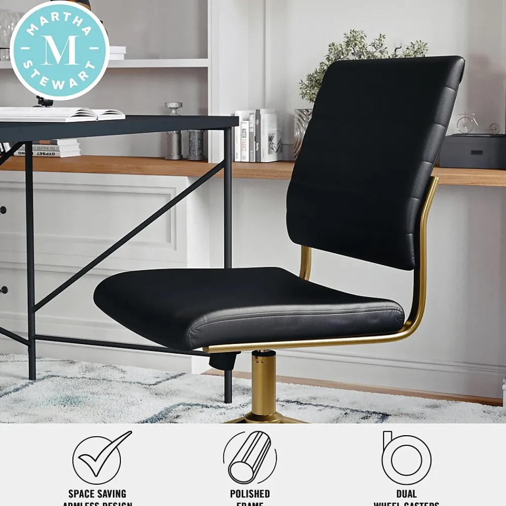 The Martha Stewart Ivy Armless Office Chair pairs traditional design with clean lines to instantly update your work space. This faux leather desk chair features a polished brass frame that adds elevated sophistication to a classic look. A pneumatic height adjustment lever tucked beneath the 360° swivel seat offers a custom seating experience to keep you comfortable throughout your workday. Assembly is easy with the included tools and step-by-step instructions.