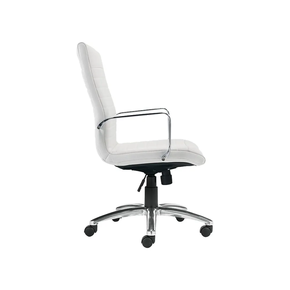 This Offices to go executive chair features Luxhide upholstery with mock leather trim. Pneumatic seat provides height adjustment. Single-position tilt lock with swivel tilt mechanism and tilt tension adjustment. Also featuring concealed frame with polished aluminum base and twin-wheel carpet casters.