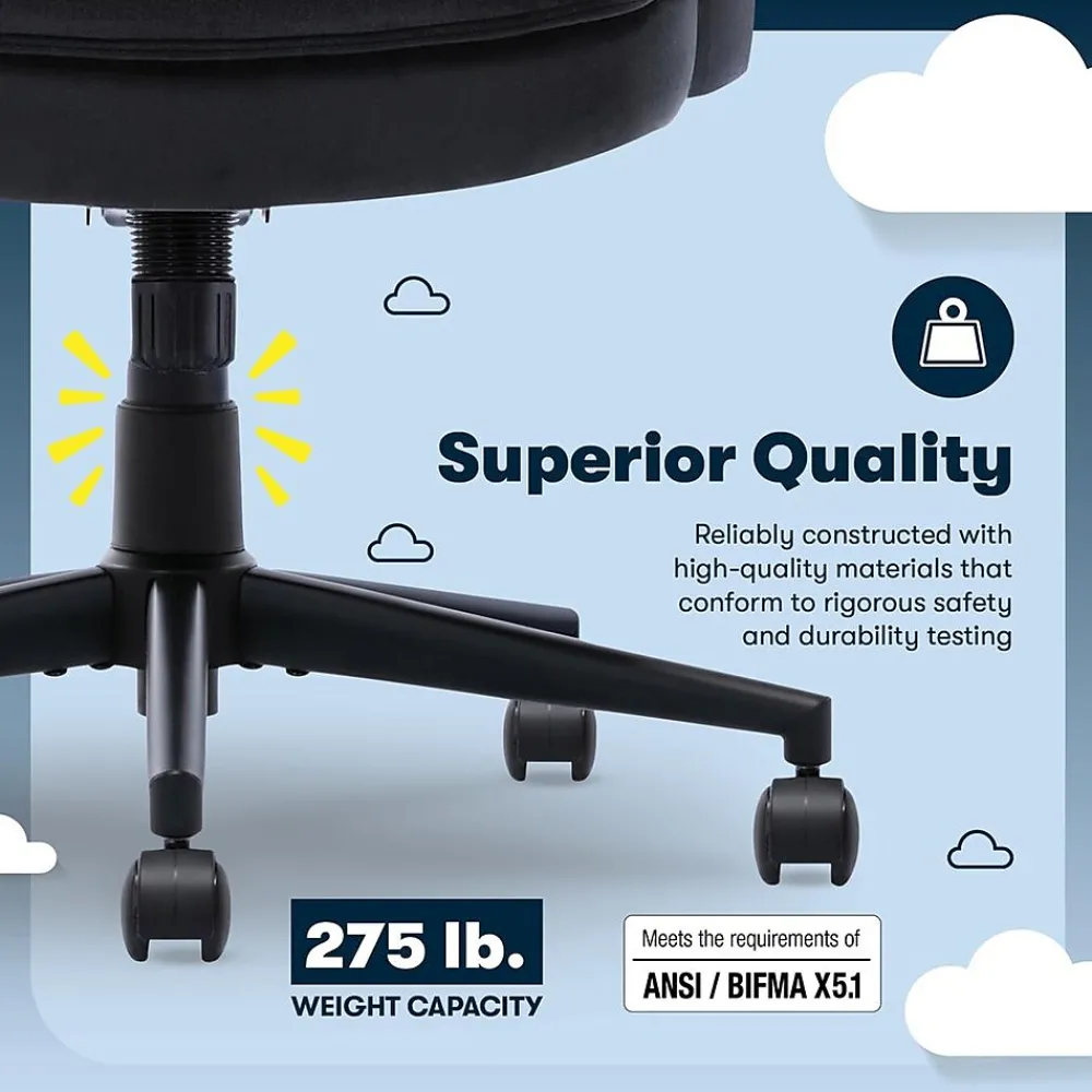 The better you sit, the better you’ll feel. Whether for work, play, or any other activity that has you sitting in our chairs, we believe comfort is everything. We know it’s a big responsibility and take it seriously, just as we do with our mattresses. With over 15 years of making chairs and innovating with designs, materials, and technology, Serta knows what it takes to give you a comfortable sit. Feel ready to take on the day every time you’re sitting at your desk with the Serta Comfort Classic. This mid-back office chair prioritizes the way you feel with layered body pillows, padded armrests, and a semi-plush seat cushion that’s double-layered with thick, non-recycled Serta foam. It’s covered in ultra-soft velvet fabric and available in 4 contemporary colors – Gray, Taupe, Pink, or Black. Mindful of the way the body shifts positions throughout the day, the Comfort Classic features ergonomic contours in the backrest to adapt to your posture. There’s also support in the lumbar region to promote natural spinal alignment and reduce strain on your lower back. The 360° swivel metal base on double-wheel casters glides smoothly across carpets or rugs, and can handle up to 275 lbs. Finding your ideal seated position is easy with the one-touch side lever for convenient height adjustment and tilt-lock to match your work style and desk set-up. Designed for comfort, but delivering stylish ergonomics, the Comfort Classic executive chair is your workday partner to check off the boxes on your to-do list. Add it to your cart and order today.