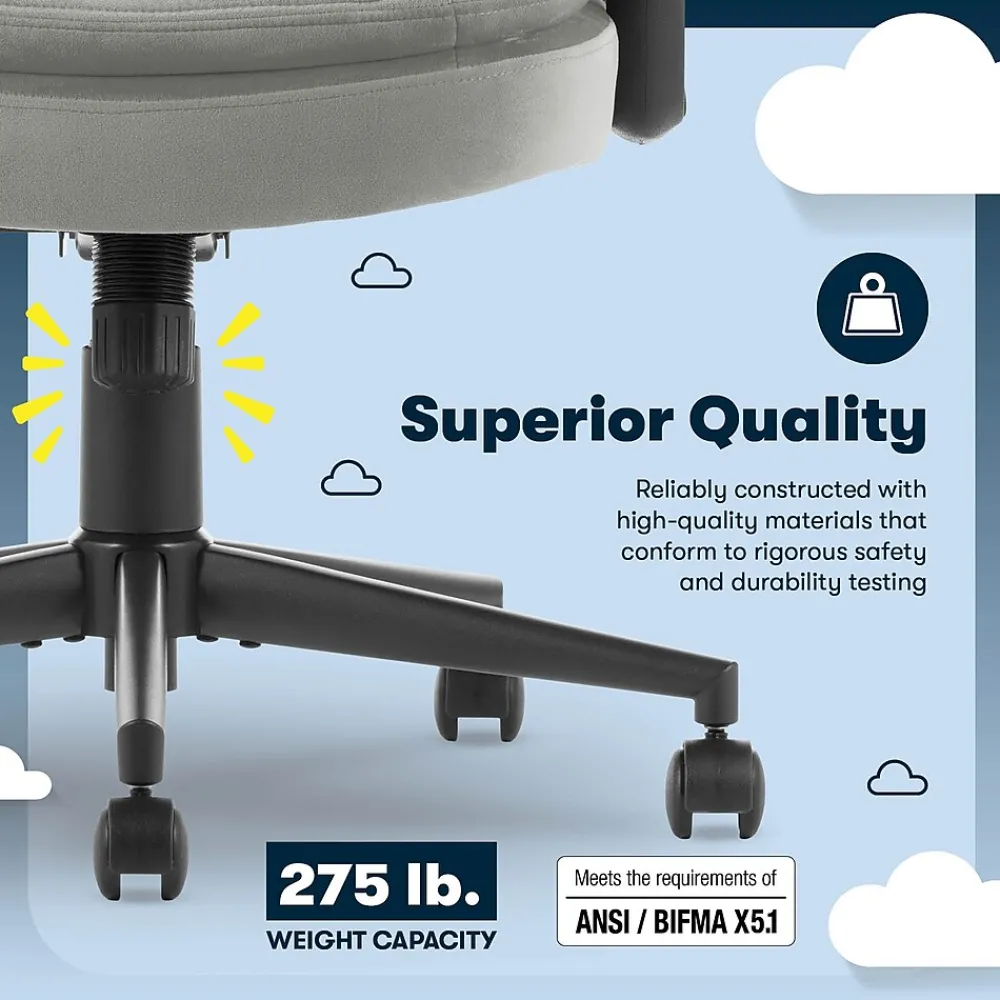 The better you sit, the better you’ll feel. Whether for work, play, or any other activity that has you sitting in our chairs, we believe comfort is everything. We know it’s a big responsibility and take it seriously, just as we do with our mattresses. With over 15 years of making chairs and innovating with designs, materials, and technology, Serta knows what it takes to give you a comfortable sit. Make your desk a place you love to be with the Comfort Ergo chair. Its modern aesthetic and ergonomic features ensure you can work comfortably and efficiently throughout your workday. Because the body shifts and moves into different positions, the mid-back design allows for natural mobility in the upper body and arms for freedom of movement. Gentle contours in the backrest conform to your natural spinal curves and provide lumbar support to encourage good posture and reduce pressure on your lower back. Whether you’re seated for short durations or long, extended hours, the well-cushioned backrest, armrests, and double-layer waterfall edge seat keep you relaxed and supported with a semi-plush comfort feel. Covered in durable bonded leather or feathery soft velvet, choose from 4 versatile colors in Cognac, Black, Gray, or Pink to match your decor. A 360º swivel metal base sits atop double-wheel casters that smoothly glide over rugs and carpets, making it easy to scoot around your workstation. Plus, finding your ideal seated position is a breeze with the convenient seat-side lever to adjust the height and lock the tilt in the upright position. Feel the difference of the Serta Comfort Ergo chair every time you take a seat. It’ll help you stay focused and productive so that you can check the boxes on your daily tasks. Add it to your cart and order today.