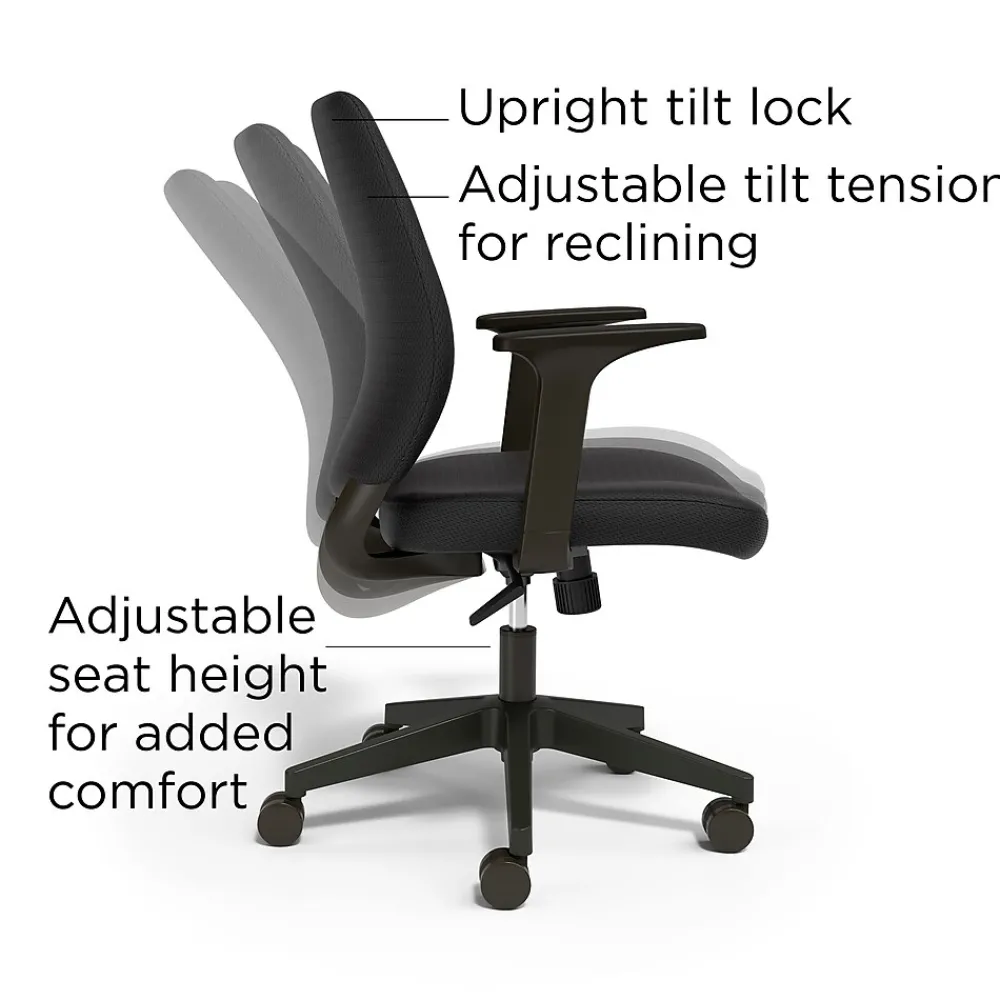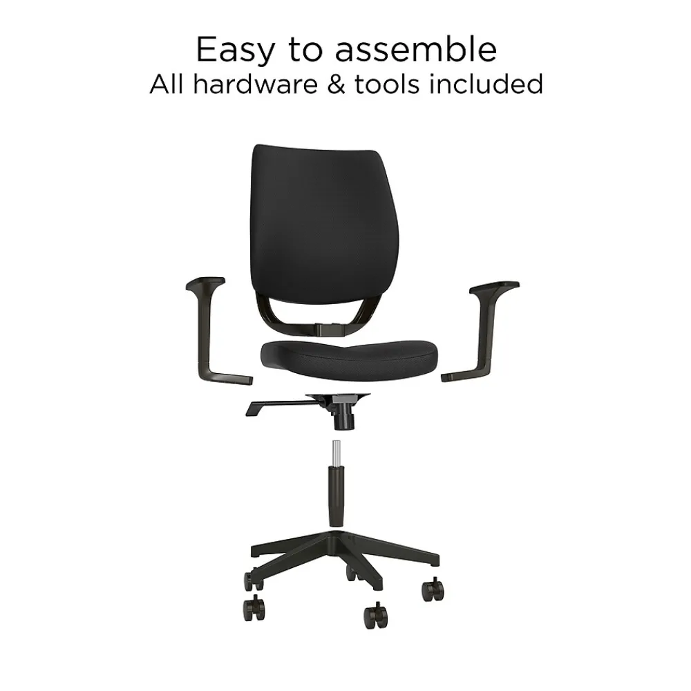 Work in comfort as you knock out your deliverables with this black fabric chair. Five swiveling casters give you full mobility around your work area, while the fabric upholstery of the contoured back and amply padded seat give you support all day, every day. Adjustable height, recline and tilt let you customize your seating for your own perfect posture and screen usage. This versatile task chair can be assembled with or without the fixed armrests, giving you a premium frame that meets ANSI/BIFMA standards at a great value. Reliable, efficient and versatile – the Staples Essentials fabric chair.
