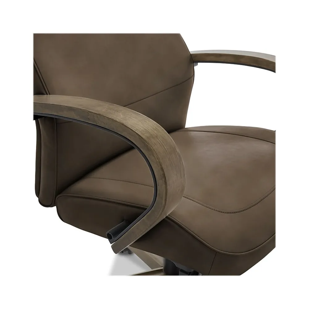 Built with quality craftsmanship and a timeless design, the Thomasville Furniture Lockhart executive office chair is a must-have addition to any home office. Featuring clean lines and a contemporary design, this modern computer chair has a versatile style that will complement a wide range of spaces. This comfortable chair has easy-to-reach height and tilt adjustment paddles, so you can make adjustments to help reduce back and neck strain. This impressive high-back office chair sits on durable rolling wheels that allow you to move quickly and efficiently. Bonded leather upholstery on the seating surface and a sturdy wood base and polished wooden arms makes this office chair an instant classic.