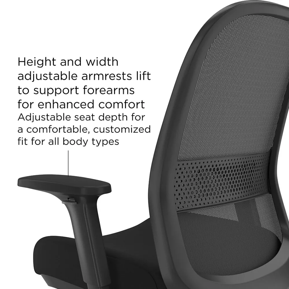 The Workplace2.0™ Bedford offers enduring quality, dependable comfort, and professional style. With intuitive design features like adjustable lumbar and seat, finding your perfect sitting position is effortless. The memory foam seat maintains its shape, while the breathable mesh back keeps you cool all day. Supported by easy gliding casters and a commercial-grade five-star base, it accommodates up to 275 lbs. Available in sleek black with a fabric seat and adjustable armrests, it ensures optimal support and alignment for your forearms and shoulders. Easily adjust reclining resistance with the side tilt tension adjustment. Customize lumbar support for personalized comfort. Experience lasting quality and comfort with the Workplace2.0™ Bedford task chair. Upgrade your workspace with a chair that’s been built to last.