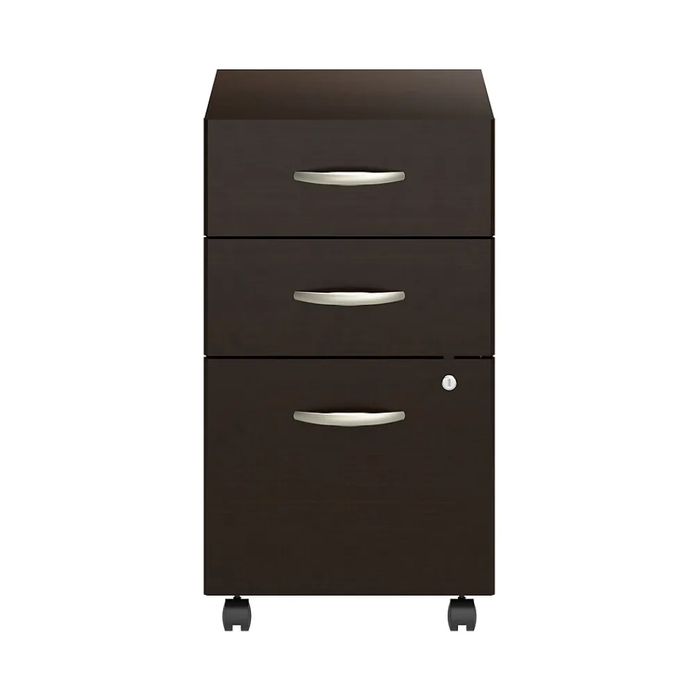 The Bush Business Furniture Arrive 3 Drawer Mobile File Cabinet presents an ideal way to add practical under desk storage to your reception area. Dual-wheeled casters allow the rolling file cabinet to move effortlessly throughout your space to provide convenient organization where it’s needed most. The file drawer opens on smooth full-extension ball bearing slides for an easy reach to letter, legal, and A4-size paperwork while two box drawers store writing utensils, notepads, and other small office supplies. A single lock secures the two bottom drawers to protect sensitive documents and valuable items. This commercial-grade portable filing cabinet has been meticulously tested to meet or exceed ANSI/BIFMA quality standards for safety, durability, and performance and is backed by the Bush Business Furniture 10 Year Manufacturer’s Warranty. American made with U.S. and imported parts.