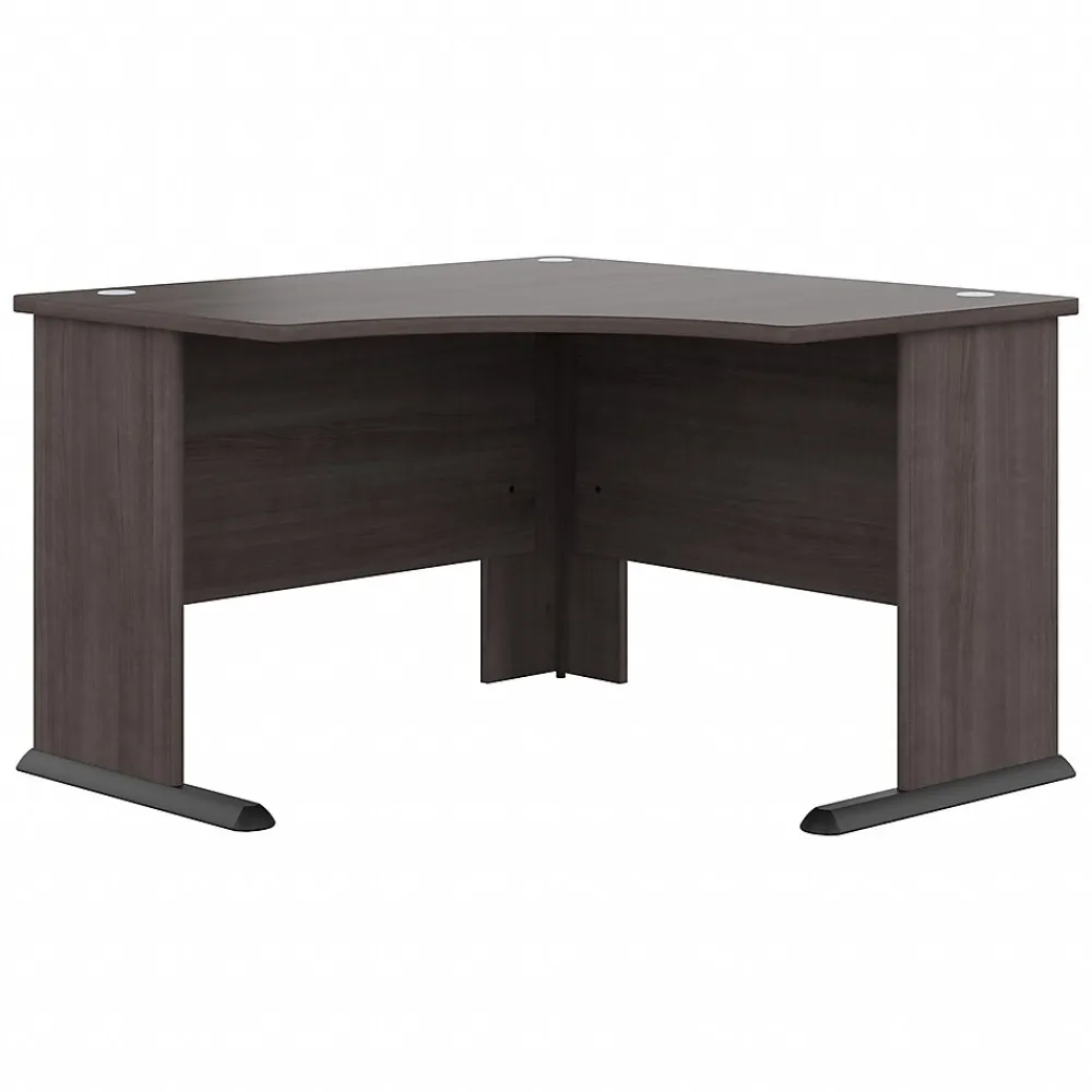 The Bush Business Furniture Studio A 48″W corner computer desk combines a fresh contemporary appearance with the commercial-quality construction needed to withstand years of everyday use. Conveniently designed to be placed in a corner of your choosing, this compact desk is a perfect choice for working or gaming where space is limited. Set up with a computer and equipment on the durable desktop that supports up to 200 lbs. Three built-in wire management grommets keep cords and cables in order, so the surface remains free from unnecessary clutter. Wall attachment hardware is included for maximum safety and security in any home or professional office. This small corner desk has been meticulously tested to meet or exceed the ANSI/BIFMA quality standards for safety, durability, and performance and is backed by a 10-year manufacturer warranty. American-made with US and imported parts.