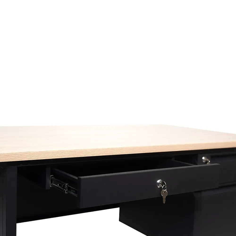 Give teachers and office workers alike a dedicated space for their tasks that is both functional and professional with this commercial grade right side single pedestal desk. Featuring a 1″ thick long-lasting laminate top, steel frame, and 3 locking drawers with ball bearing drawer slides, this multipurpose desk will stand up to the rigors of daily use. The premium materials allow this metal and wood desk to hold up to 300 lbs. static weight while the self-leveling floor glides ensure a level work surface. Assembly takes 30 minutes or less and a damp cloth is all that is needed to maintain the appearance of this must-have work space.