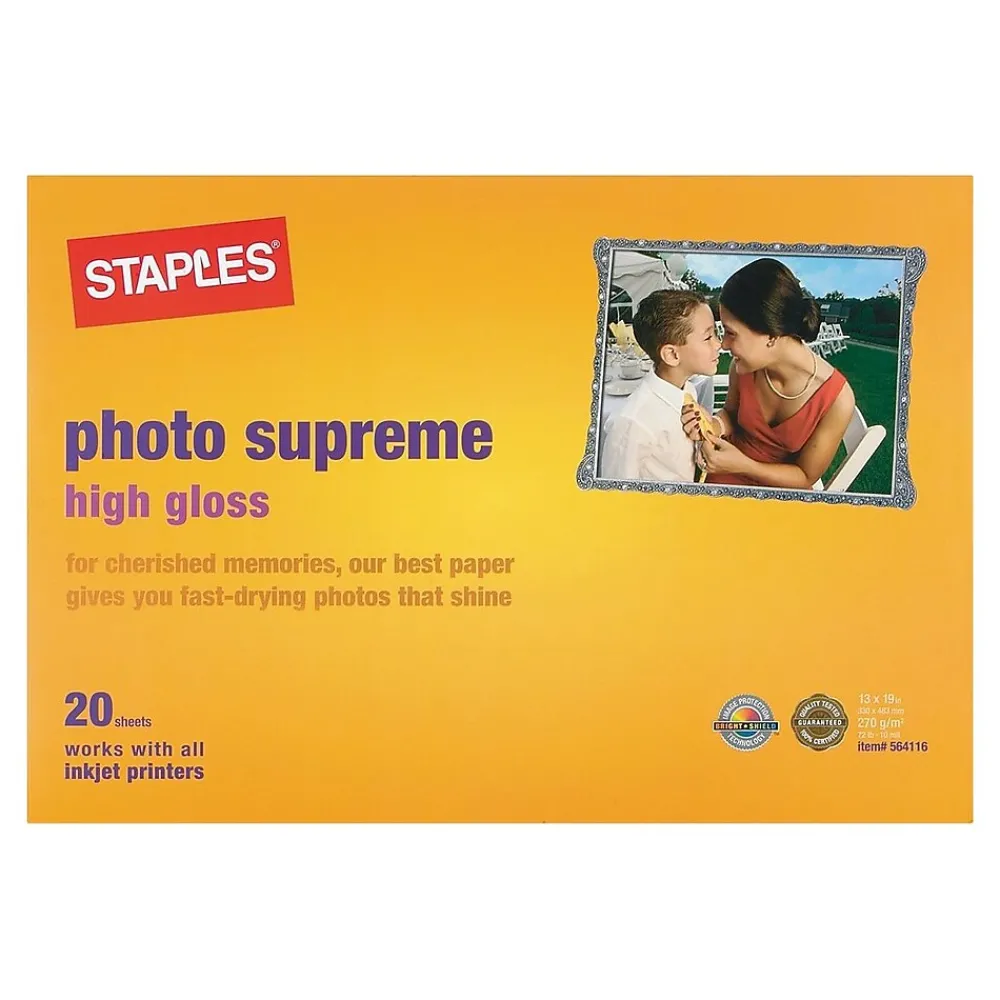 Make images look glossy and professional with this photo supreme gloss paper. Each page is tear and curl resistant for a high-quality look, while the acid-free material keeps it from yellowing or crumbling over time. The generous proportions of this Staples photo supreme gloss paper make it ideal for printing large photos and other images.