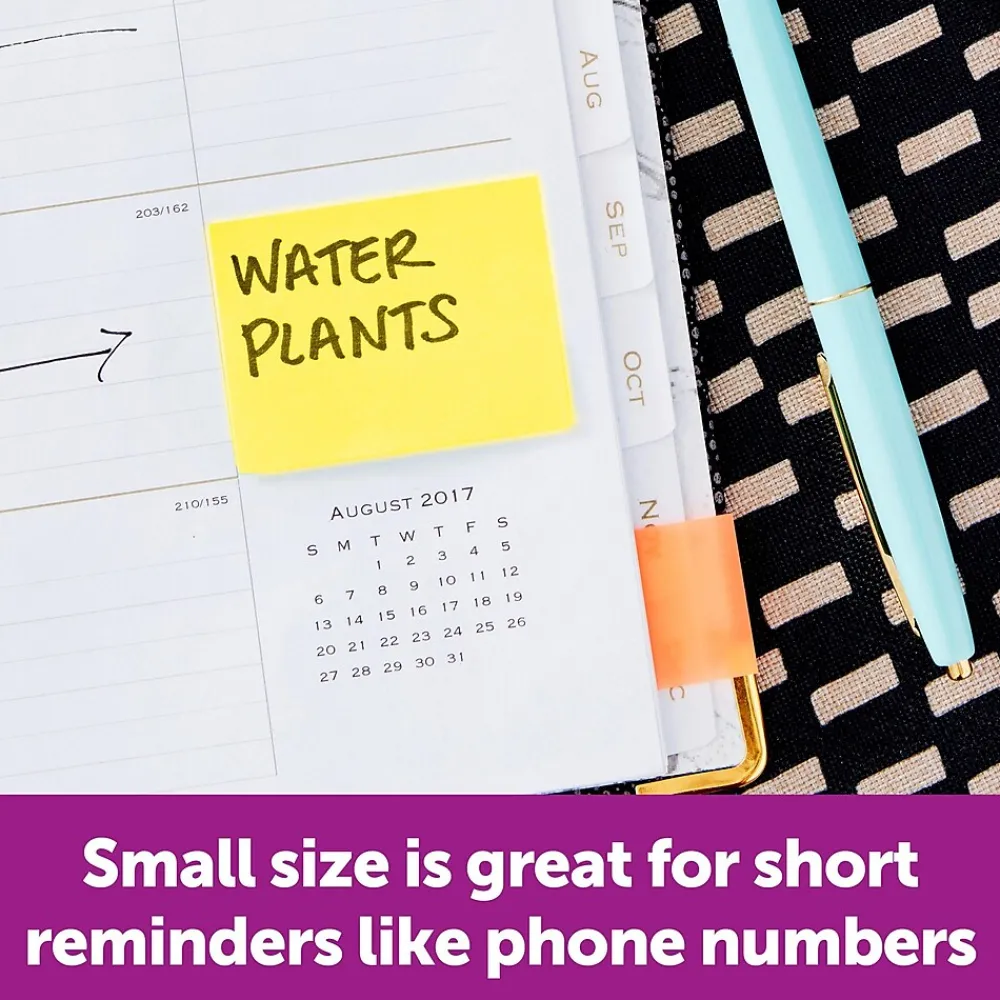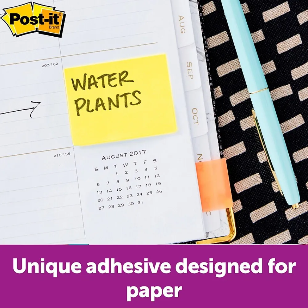 Post-it Greener Notes are the greener version of the original Post-it Notes you know and love. Made with water-based adhesive and 100% recycled paper. Use the 1 3/8 in. x 1 7/8 in. size for short reminders to yourself or others. Unique adhesive designed for use on paper or in planners. Classic Canary Yellow color ensures your notes stand out. Post-it Greener Notes are recyclable and the paper is sourced from certified, renewable and responsibly managed forests. 12 Pads/Pack, 100 Sheets/Pad.